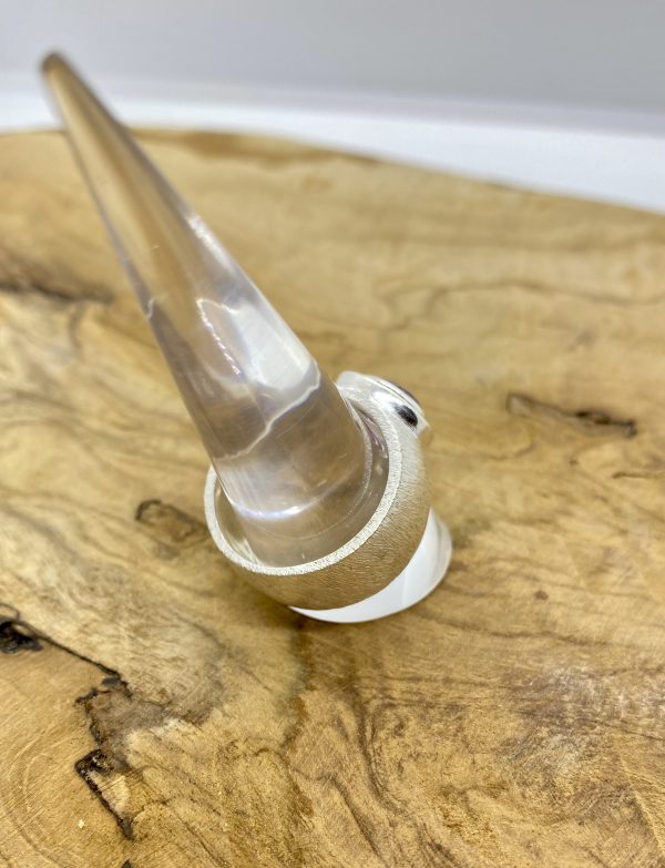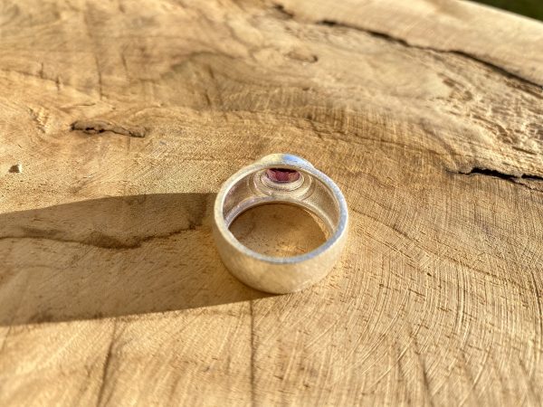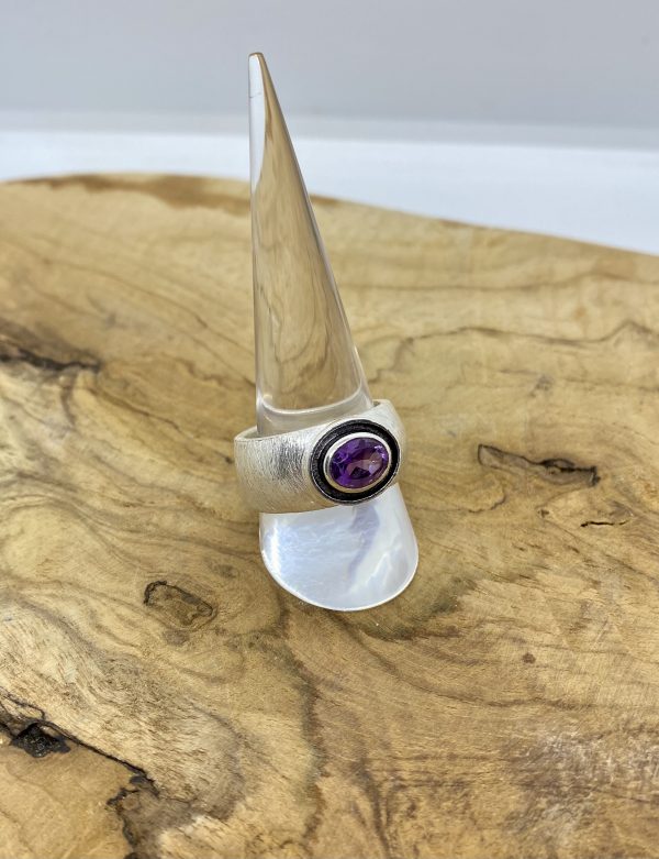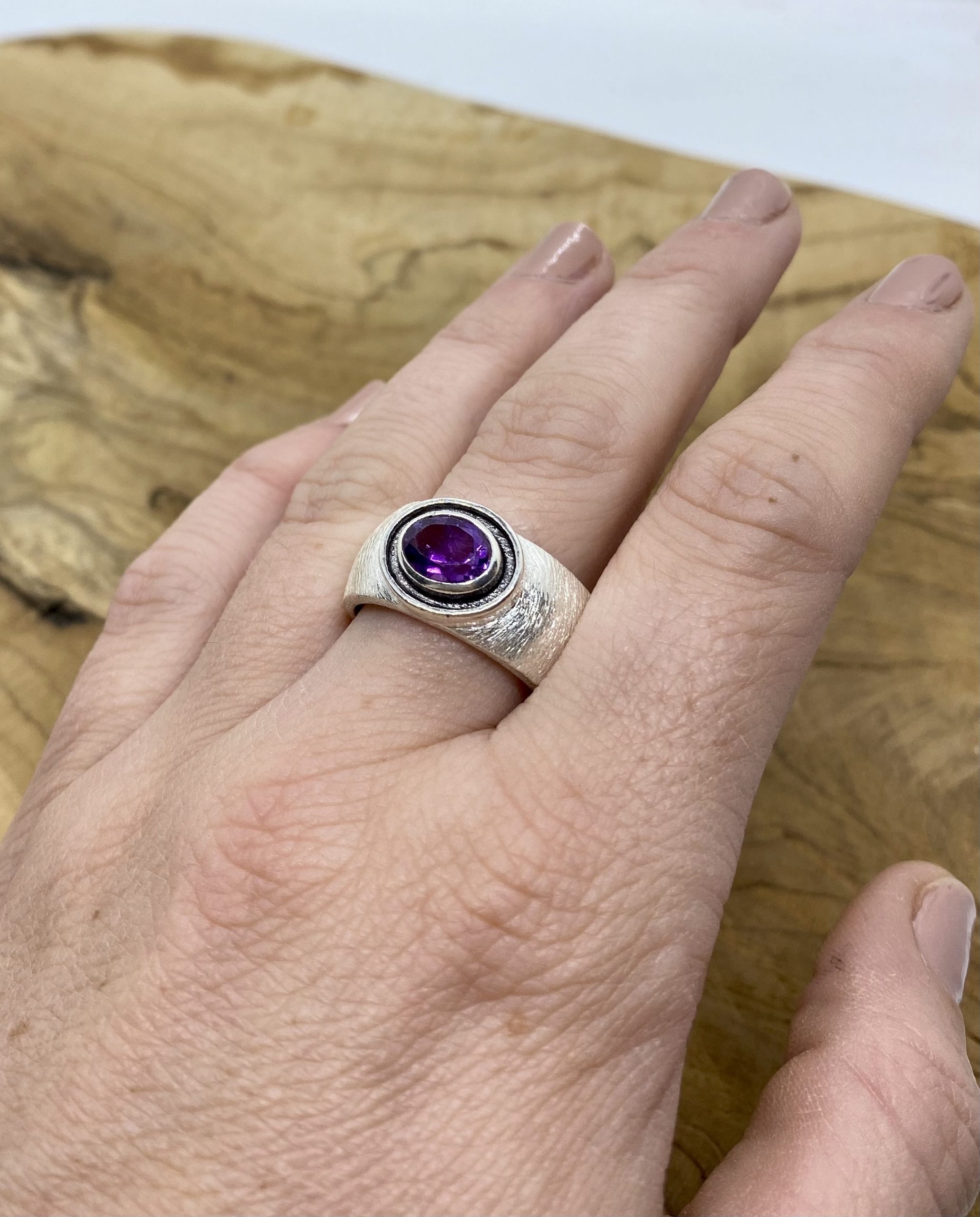 Une améthyste y est travaillé au centre, le sertissage dans la bague n’est pas complet pour apprécier la transarence de la pierre et mis en valeur par la taille en facettes.