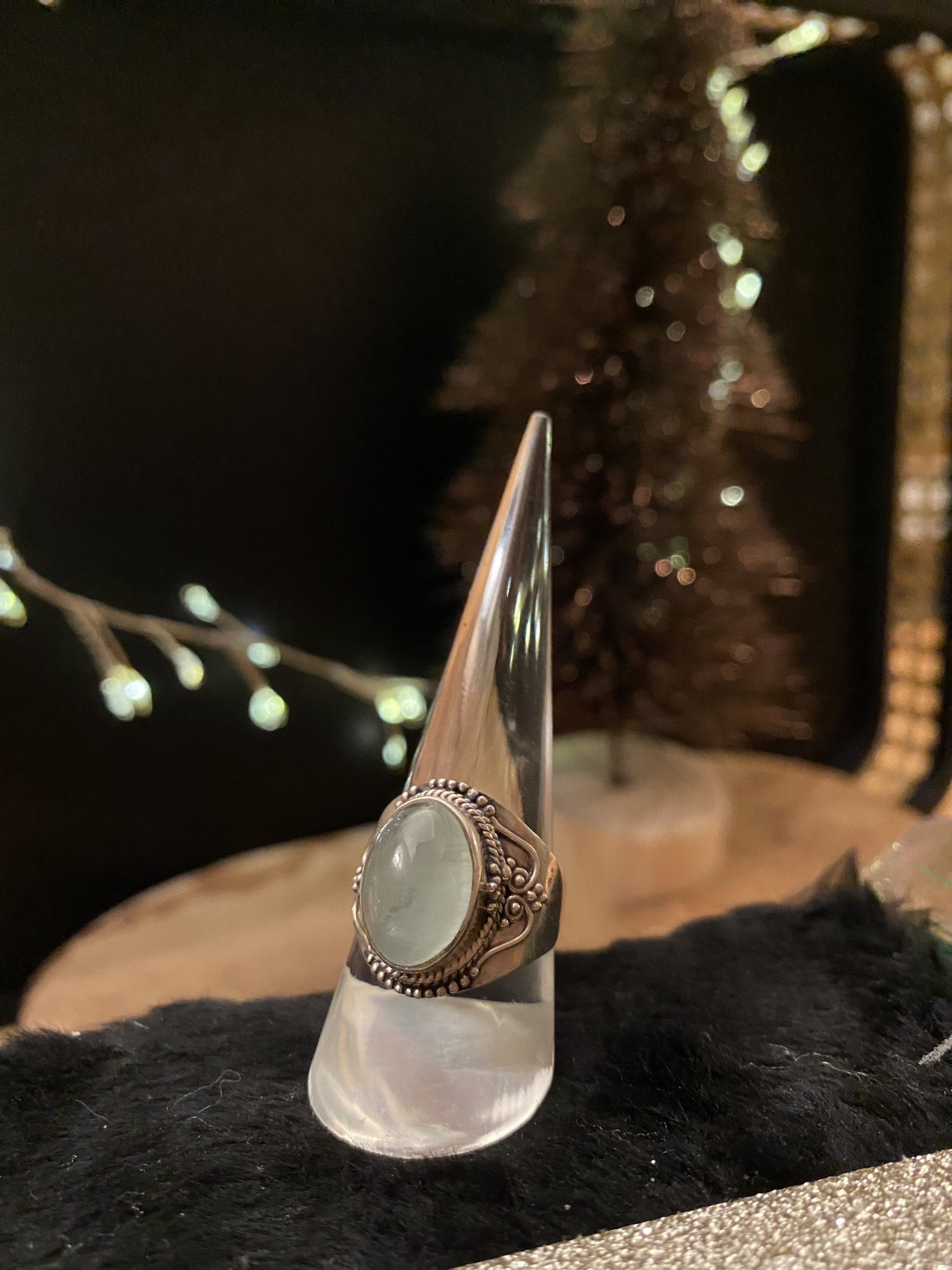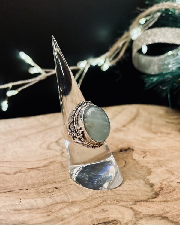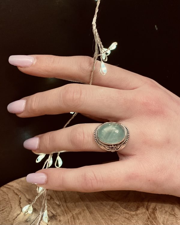 Aigue Marine taillée en cabochon et sertissage clos autour de la pierre.