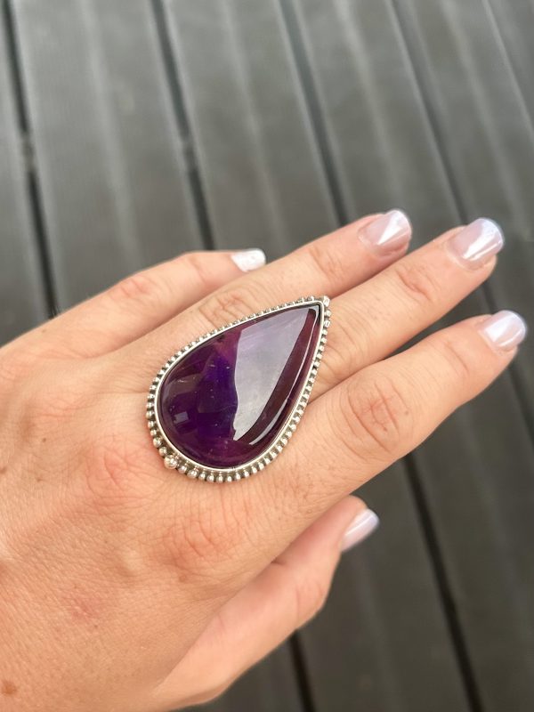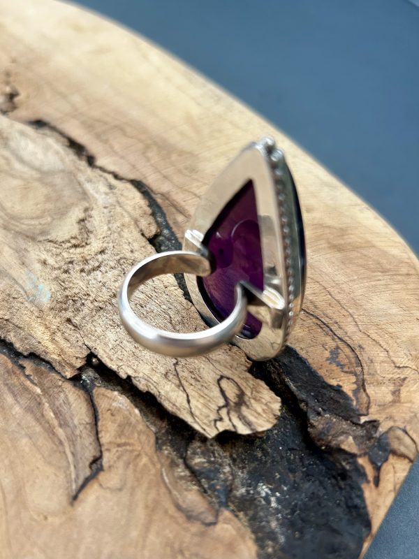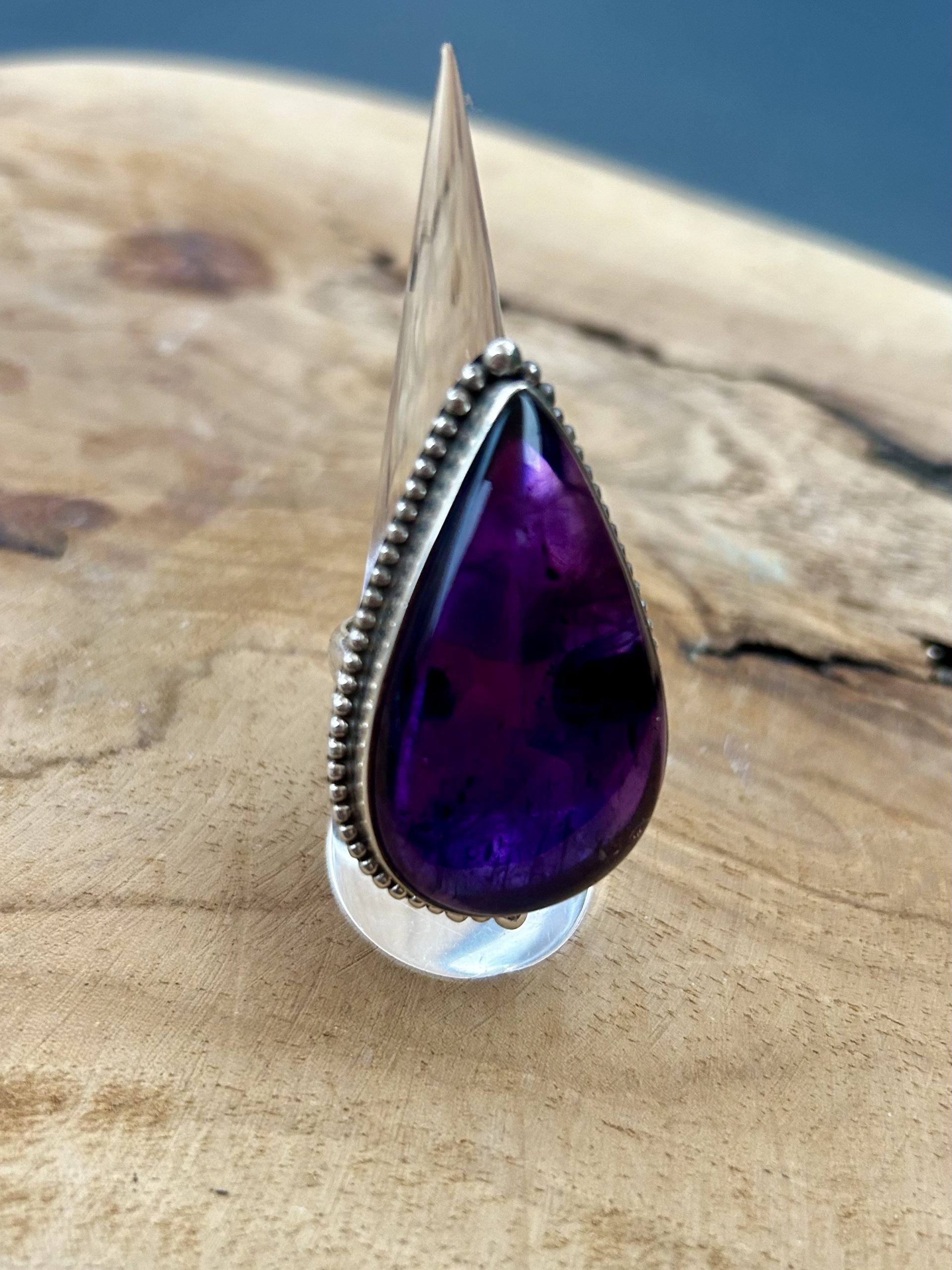 Améthyste cabochon, en forme de goute, de très belle taille.