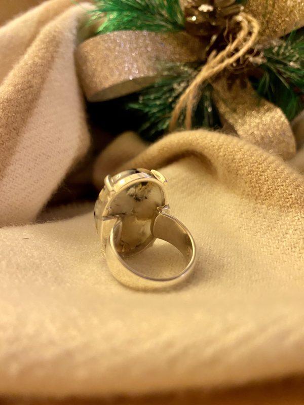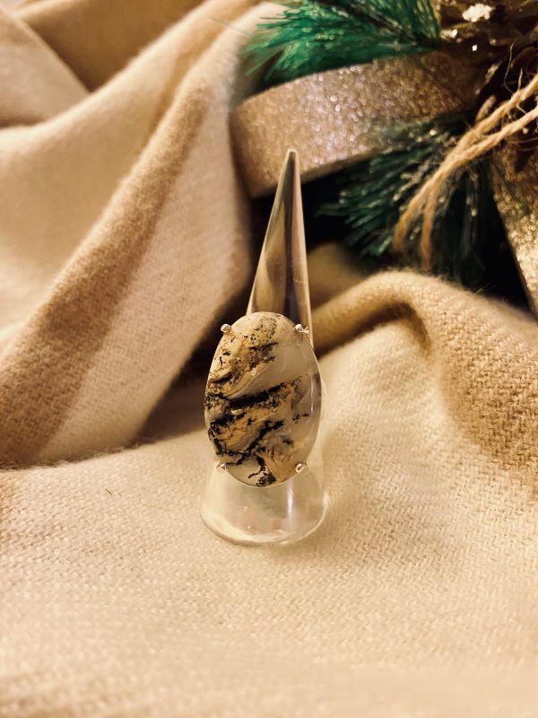 Pierre ovale en cabochon, sertissage griffe et très sobre autour de la pierre.