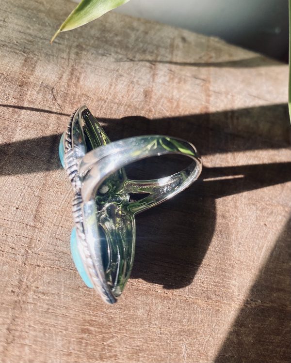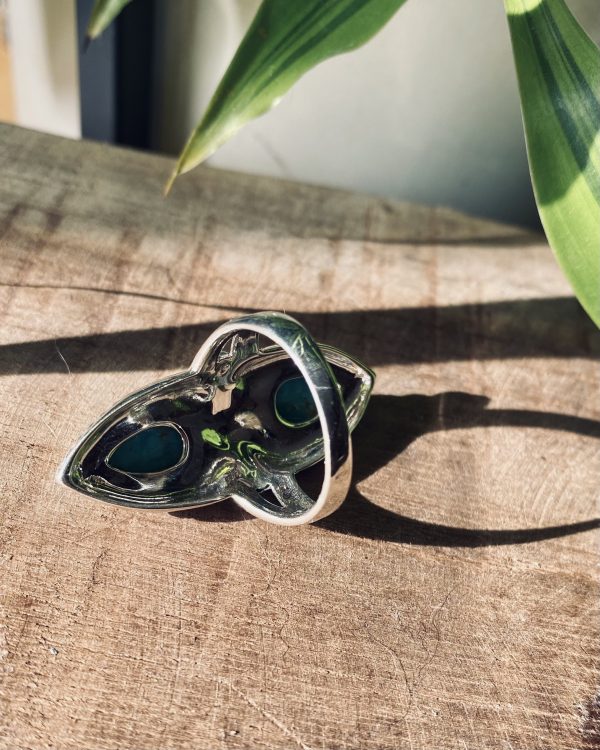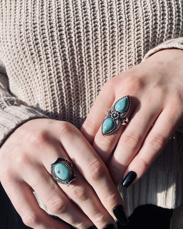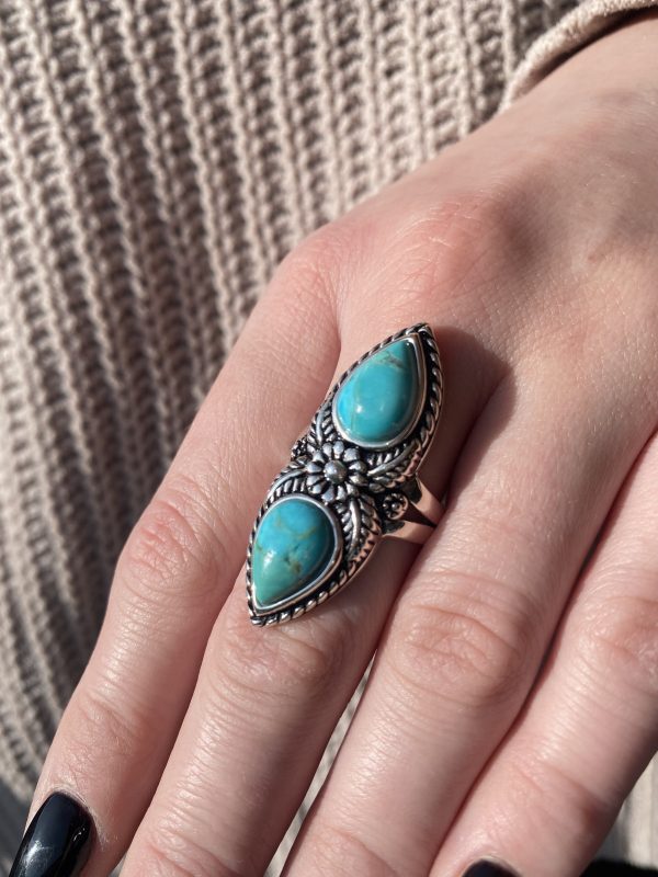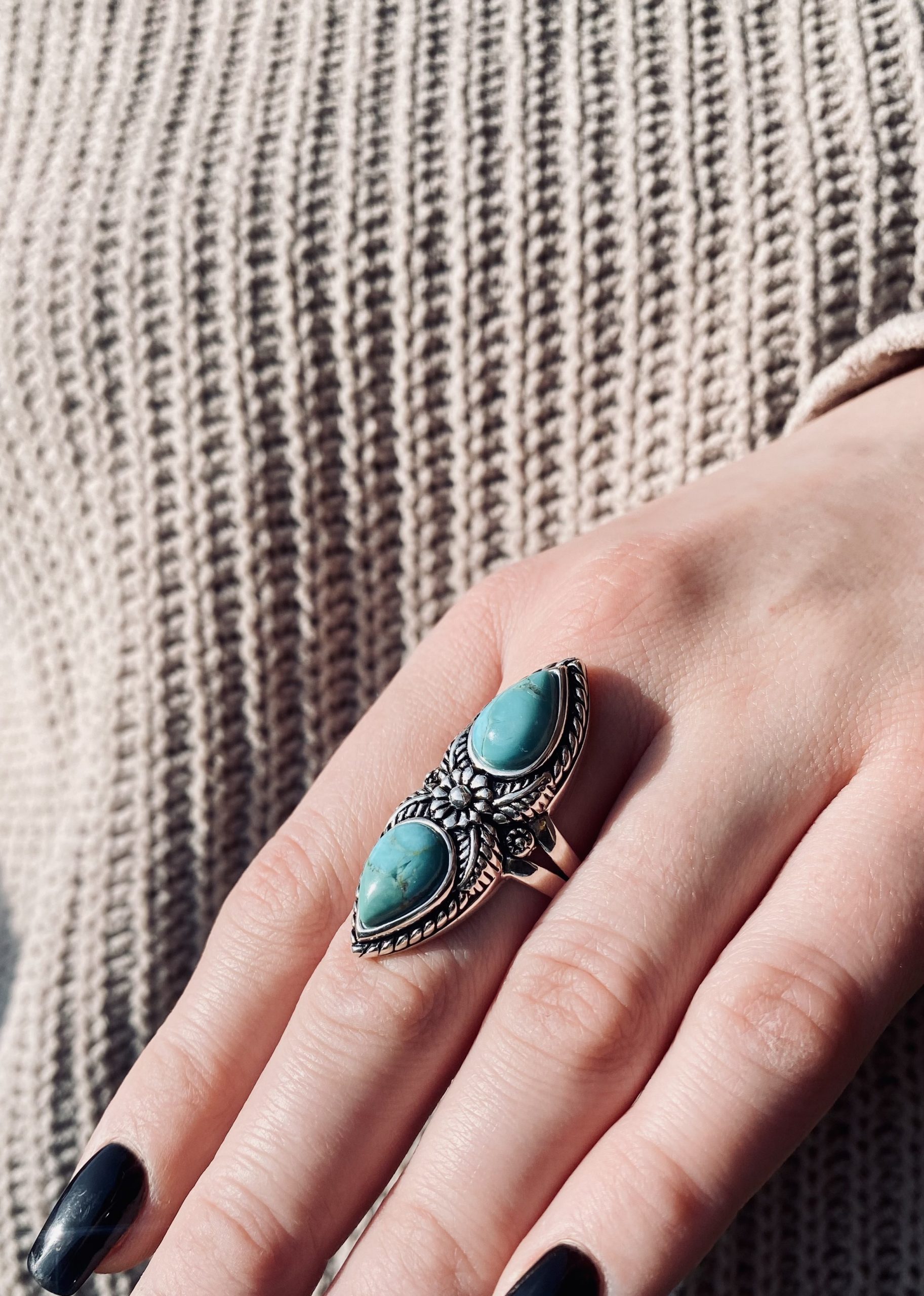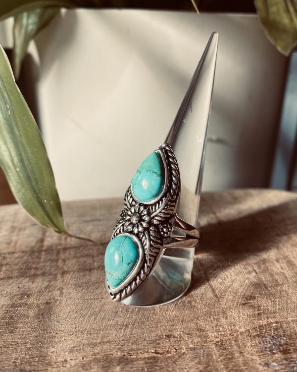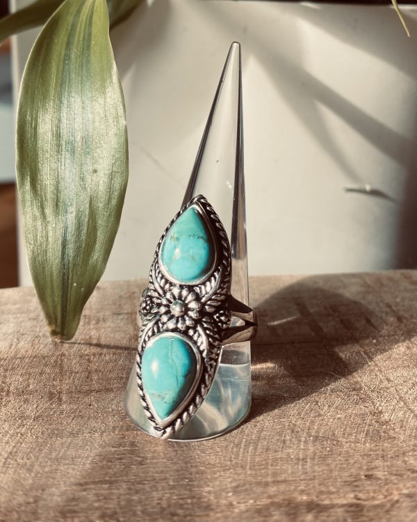 Cette bague est composée de 2 turquoises du Mexique en forme de goutte.