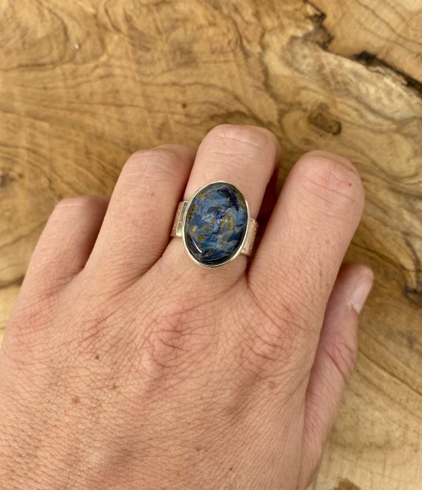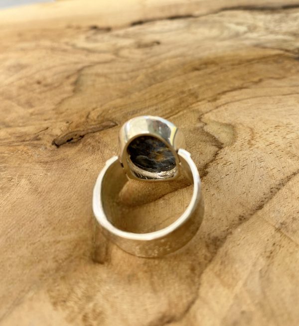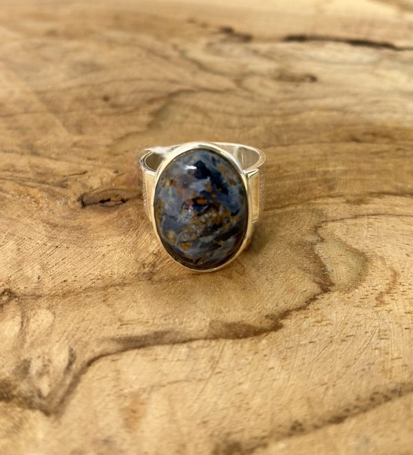 La pierre, ici pietersite est taillée en cabochon pour ce bijoux, sertissage clos.
