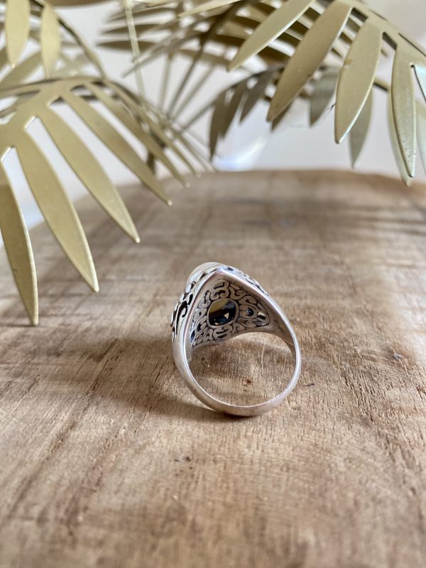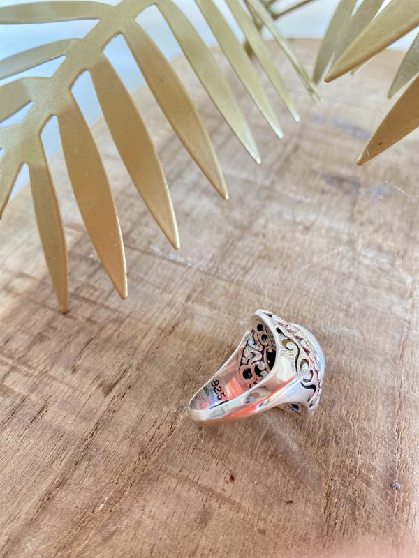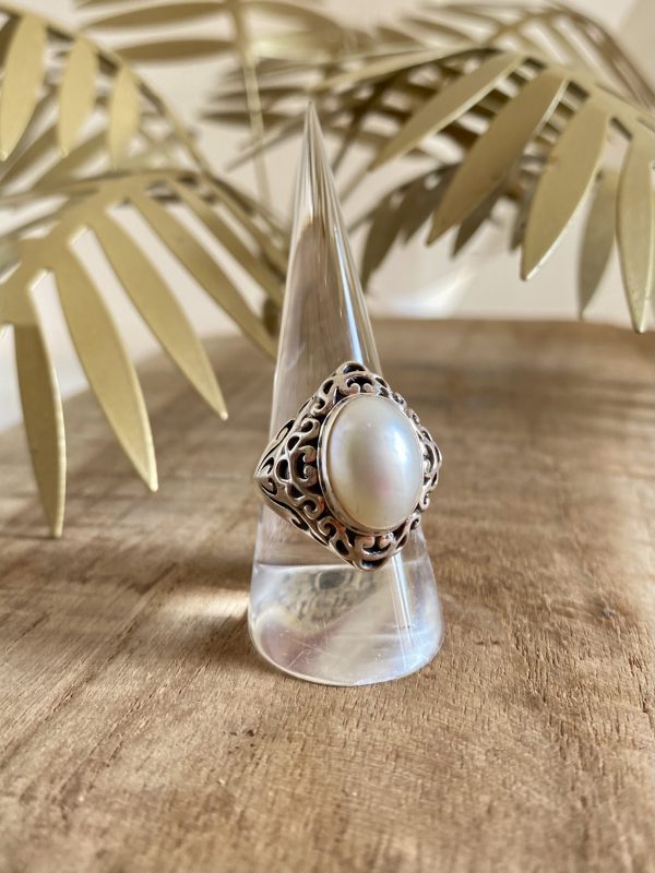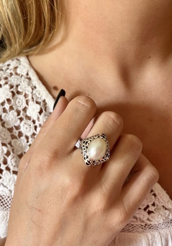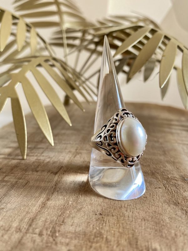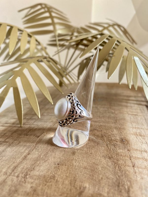Perle ronde au centre de la bague et cisellage de l’argent tout autour de la pierre ainsi qu’a l’intérieur.