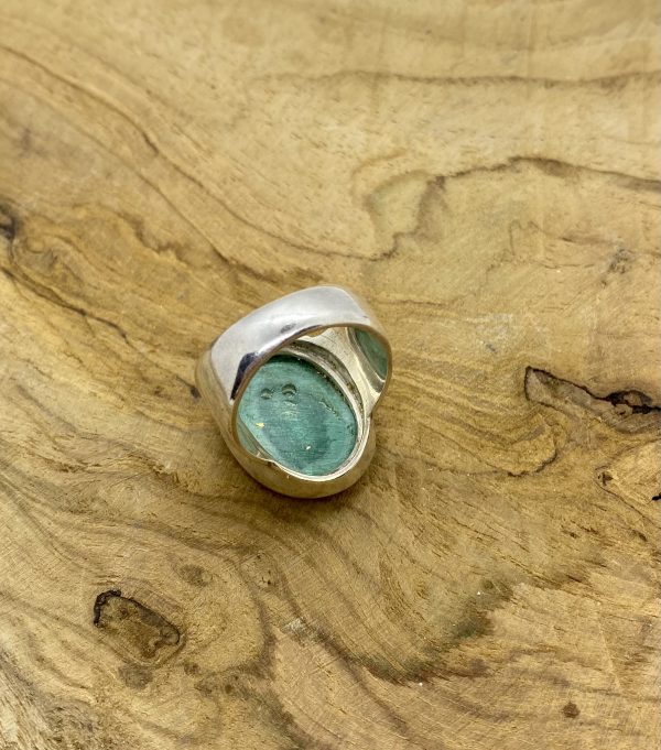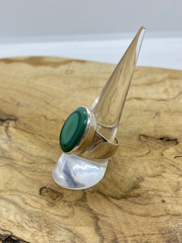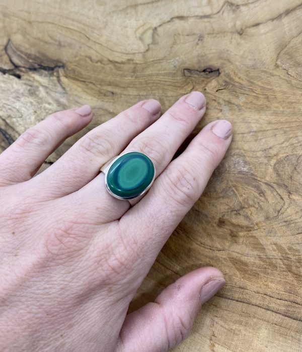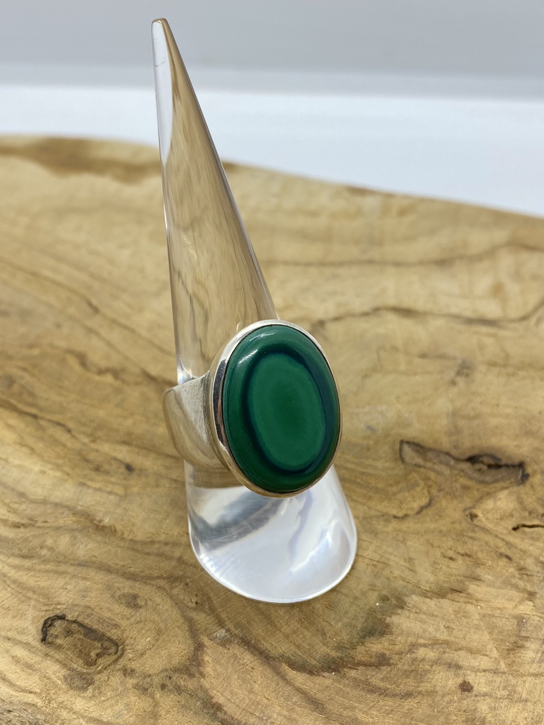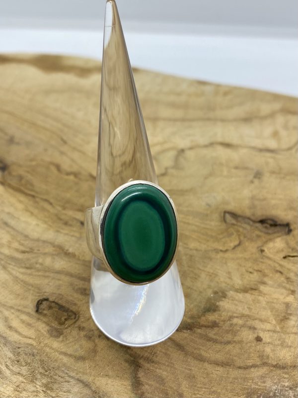 La malachite sur cette bague propose de belles couleurs de vert très sombre.