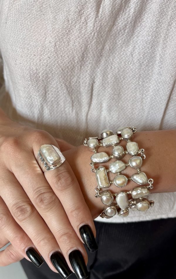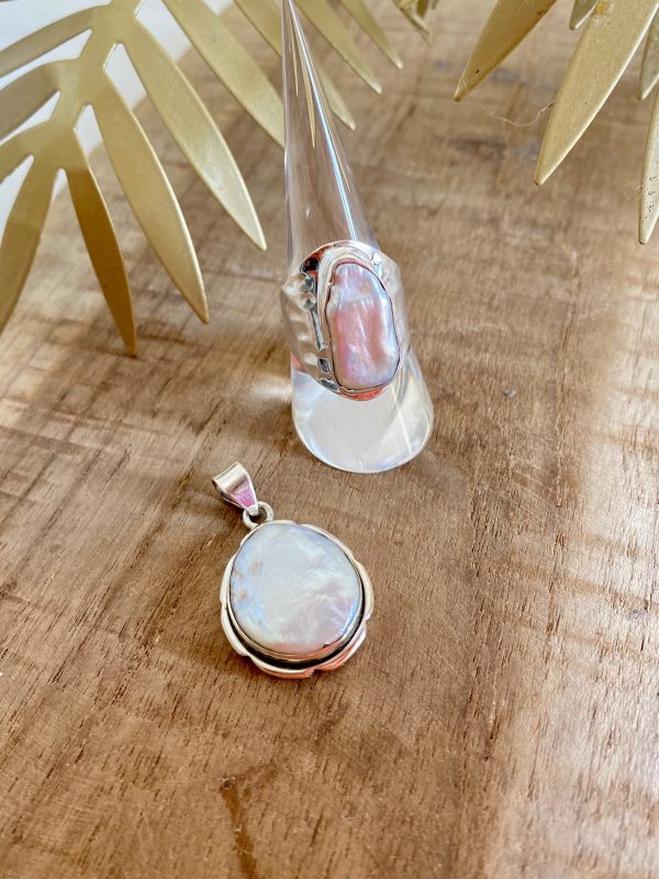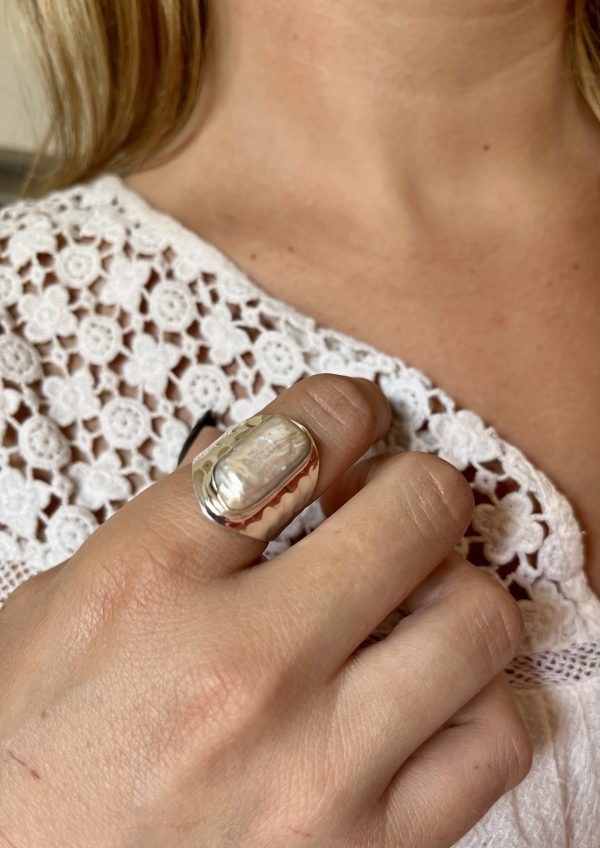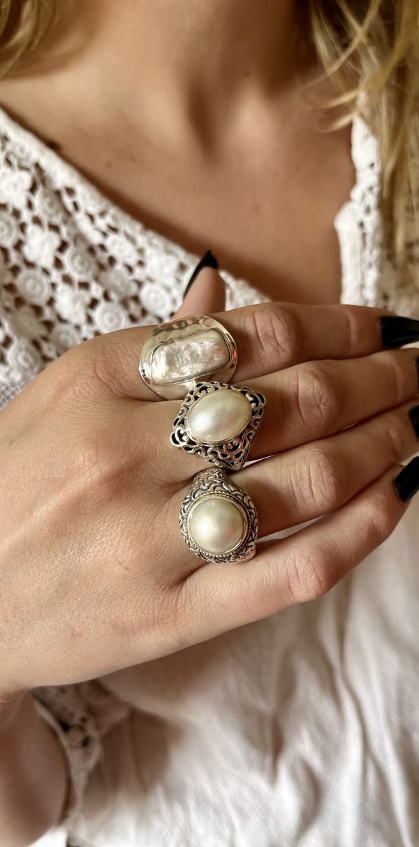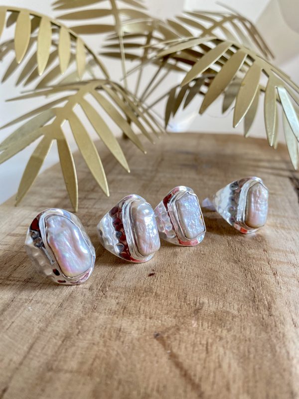 La perle sur ces bagues est en forme brute et le sertissage est formé autour de la pierre.