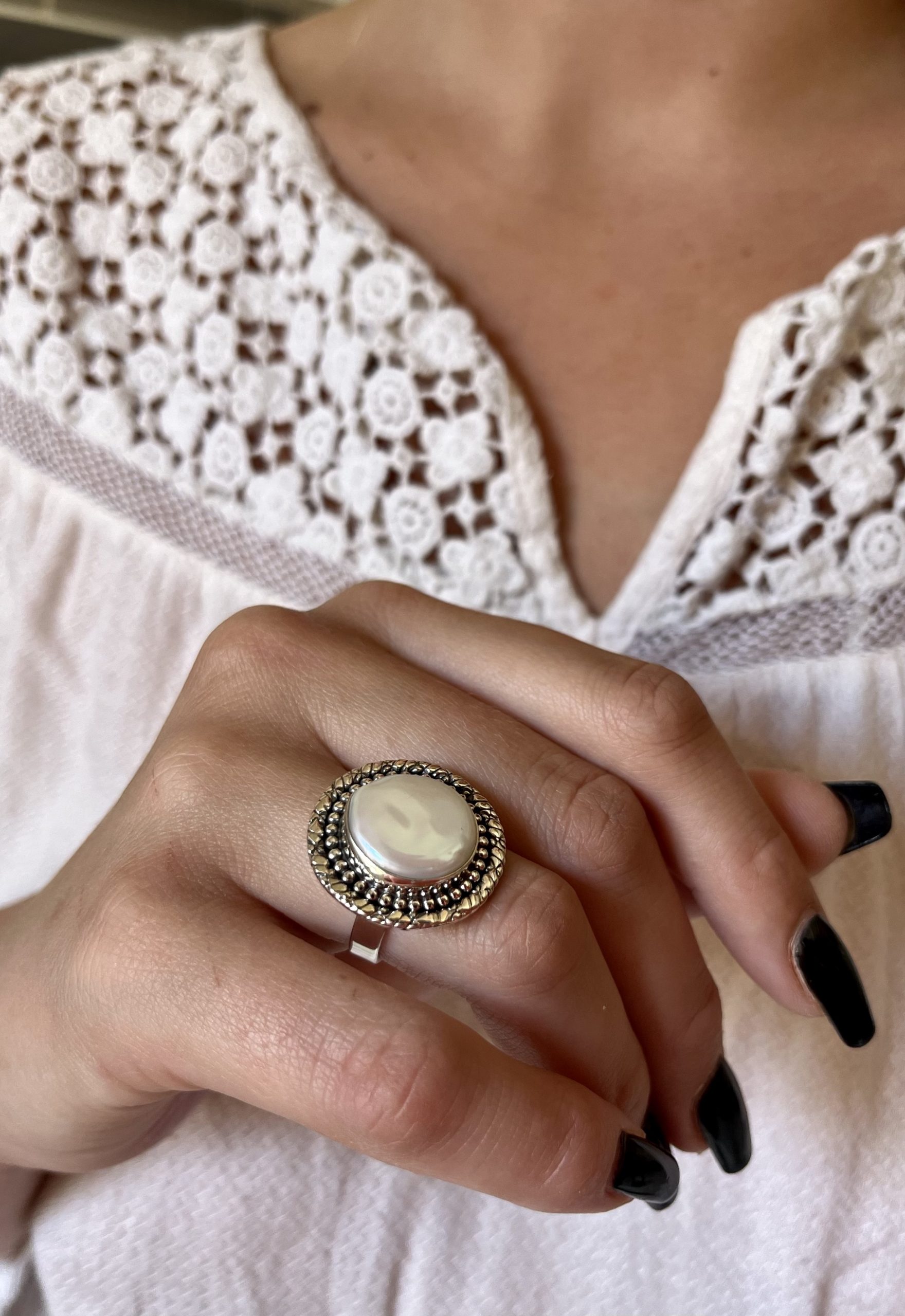 Perle d’eau douce plate et large. On retrouve des reflets irisées selon les modèles.