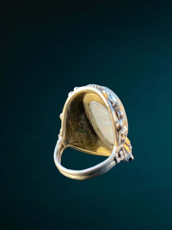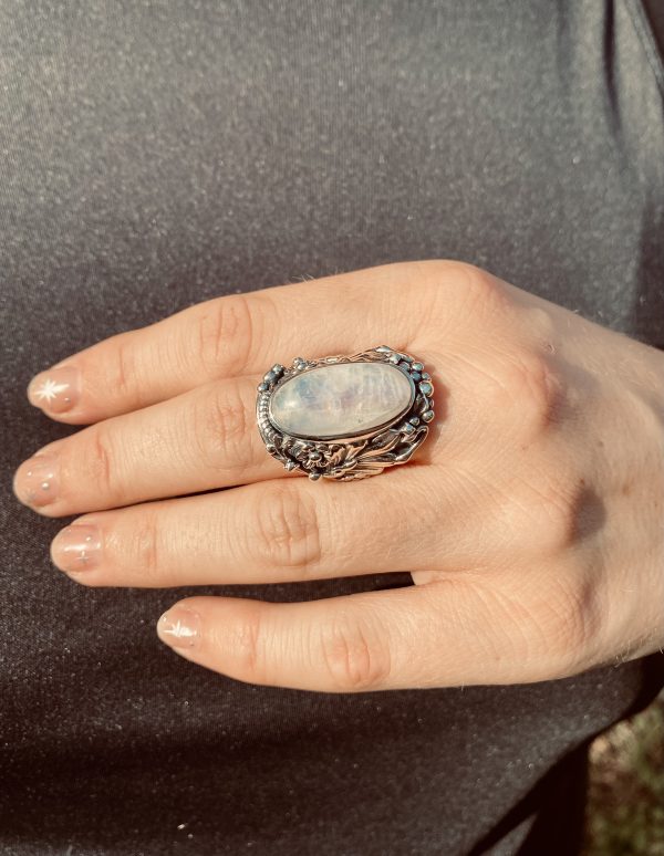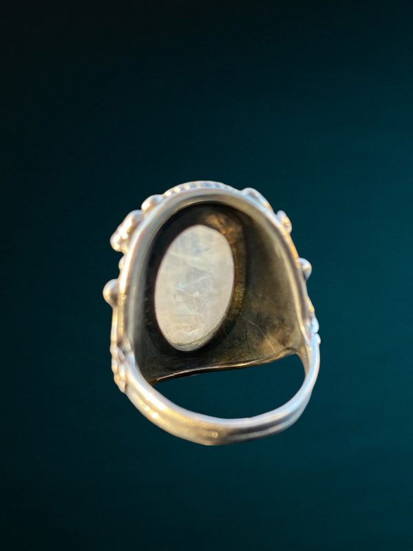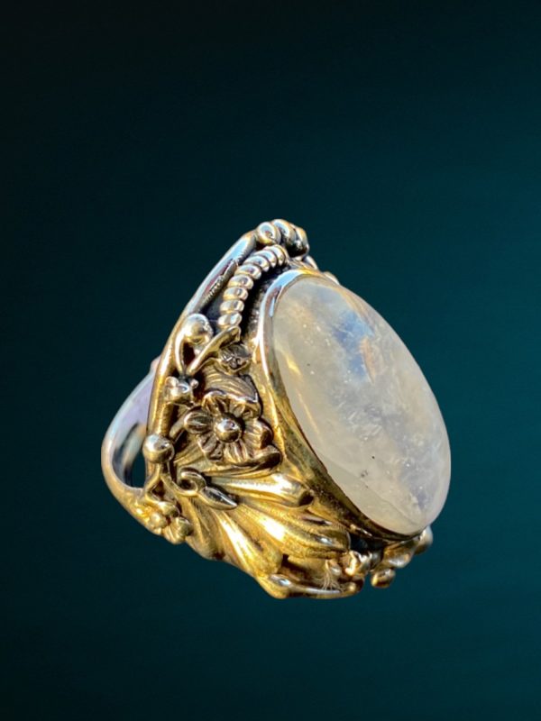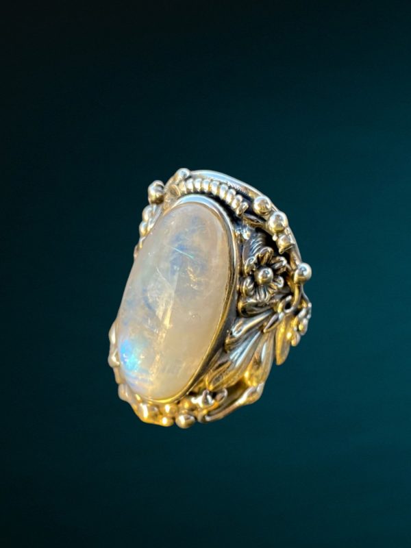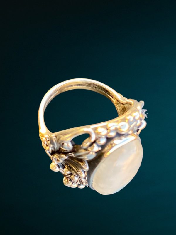 Bague en argent 925, avec une pierre de lune en cabochon, sur le sertissage en argent sont fait des motifs floraux.