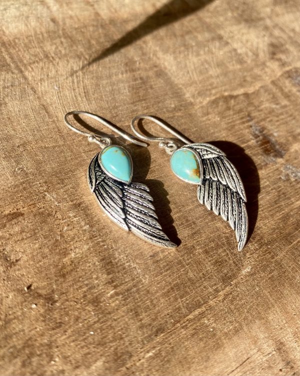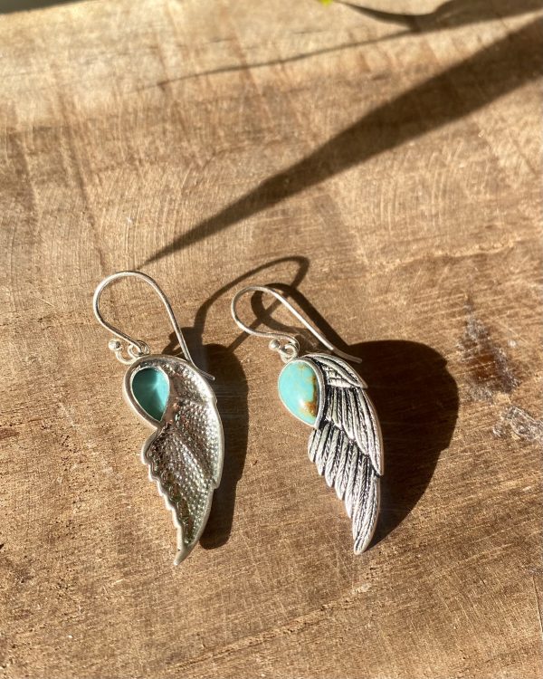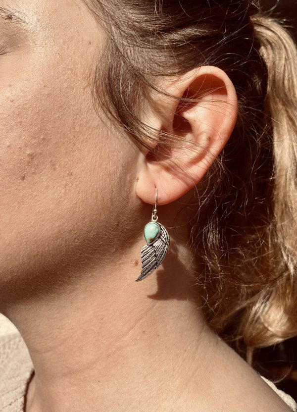 Paire de boucles d’oreilles en argent 925 et véritables turquoises en forme d’aile avec une turquoise en forme de goutte sur chaque boucle.
