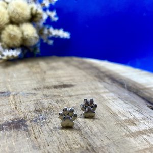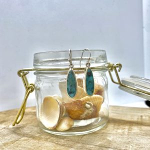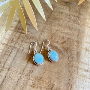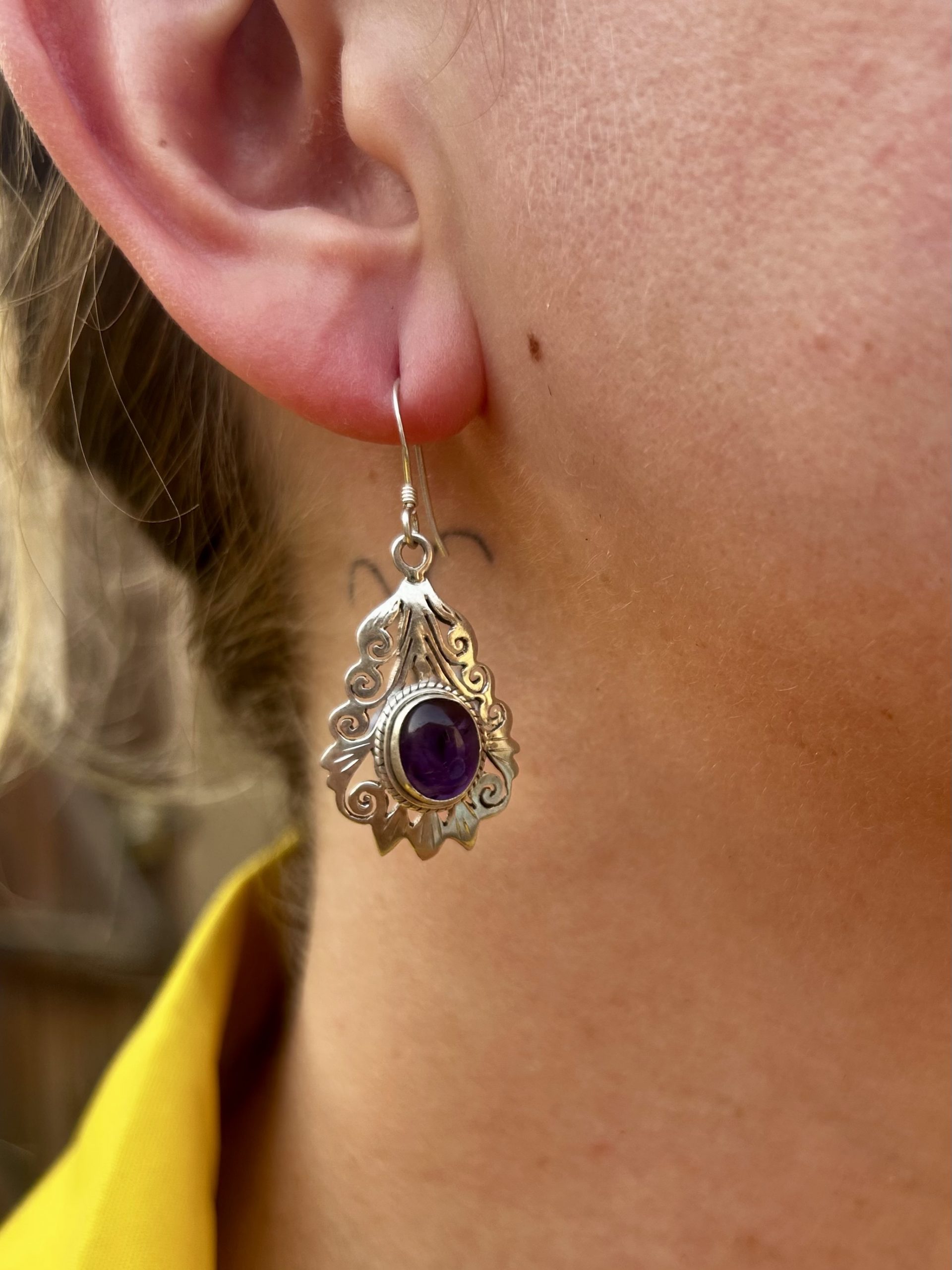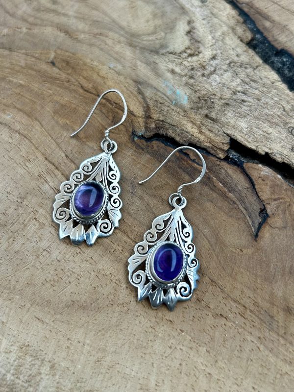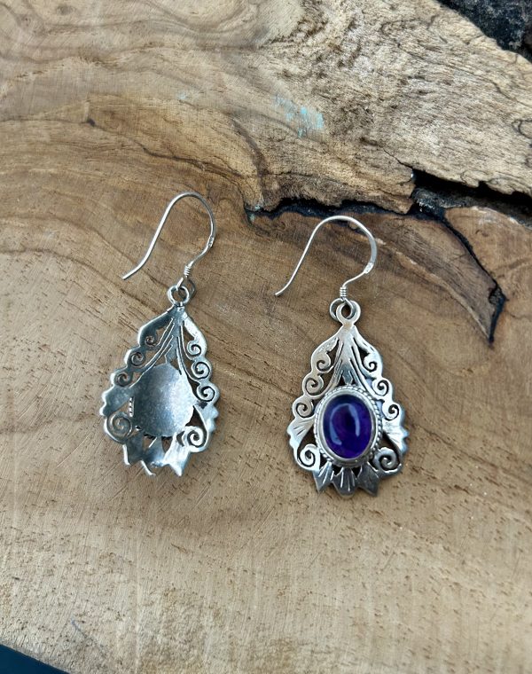 Boucles d’oreilles avec améthystes ovales taillées en cabochon. Ciselage de l’agent autour de la pierre façon népalaise.