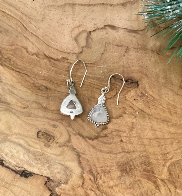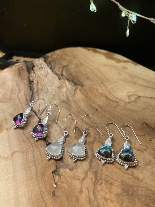 Disponibles en 3 pierres, travaillés en triangle : Améthyste, Pierre de Lune et Labradorite