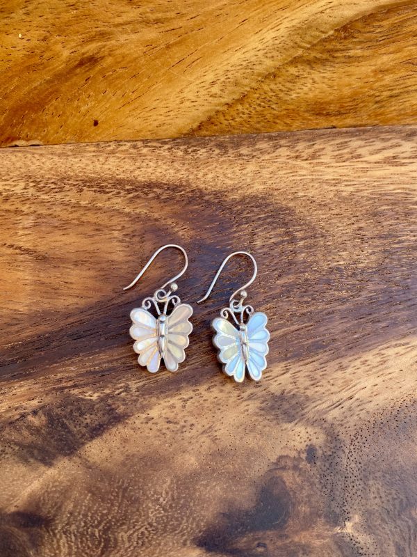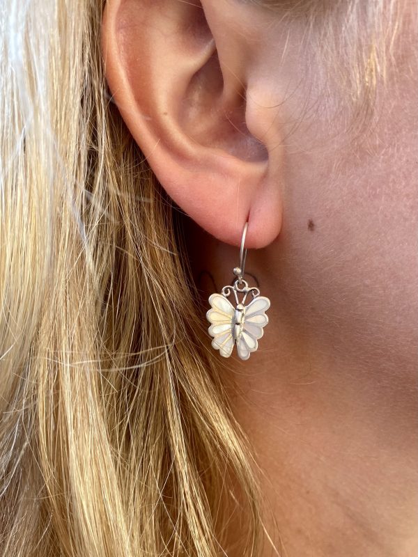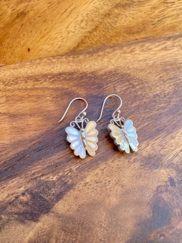 Ces boucles d’oreilles représentes des petits papillons avec ce mélange d’argent et de nacre blanche.
