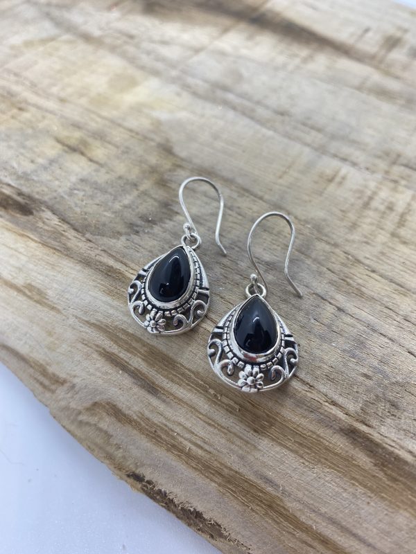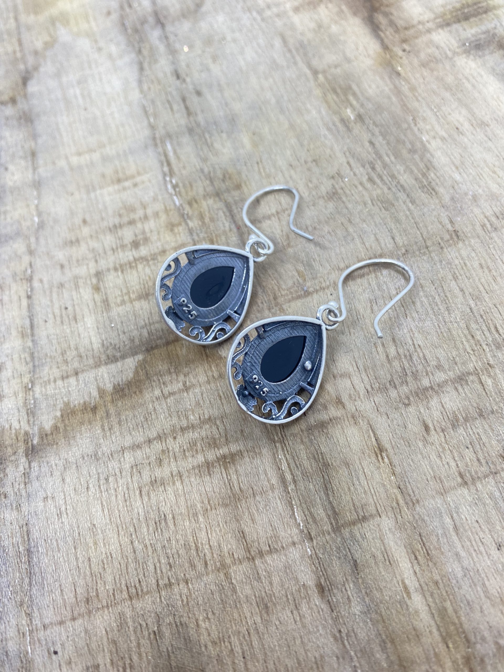 Pierres d’onyx, taillées en cabochon et en forme de goutte. montée sur une base d’argent ajourée.