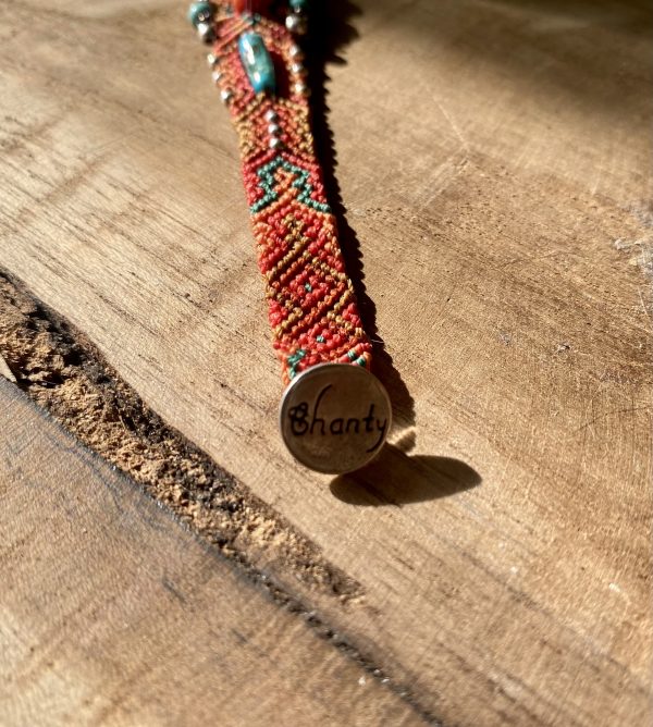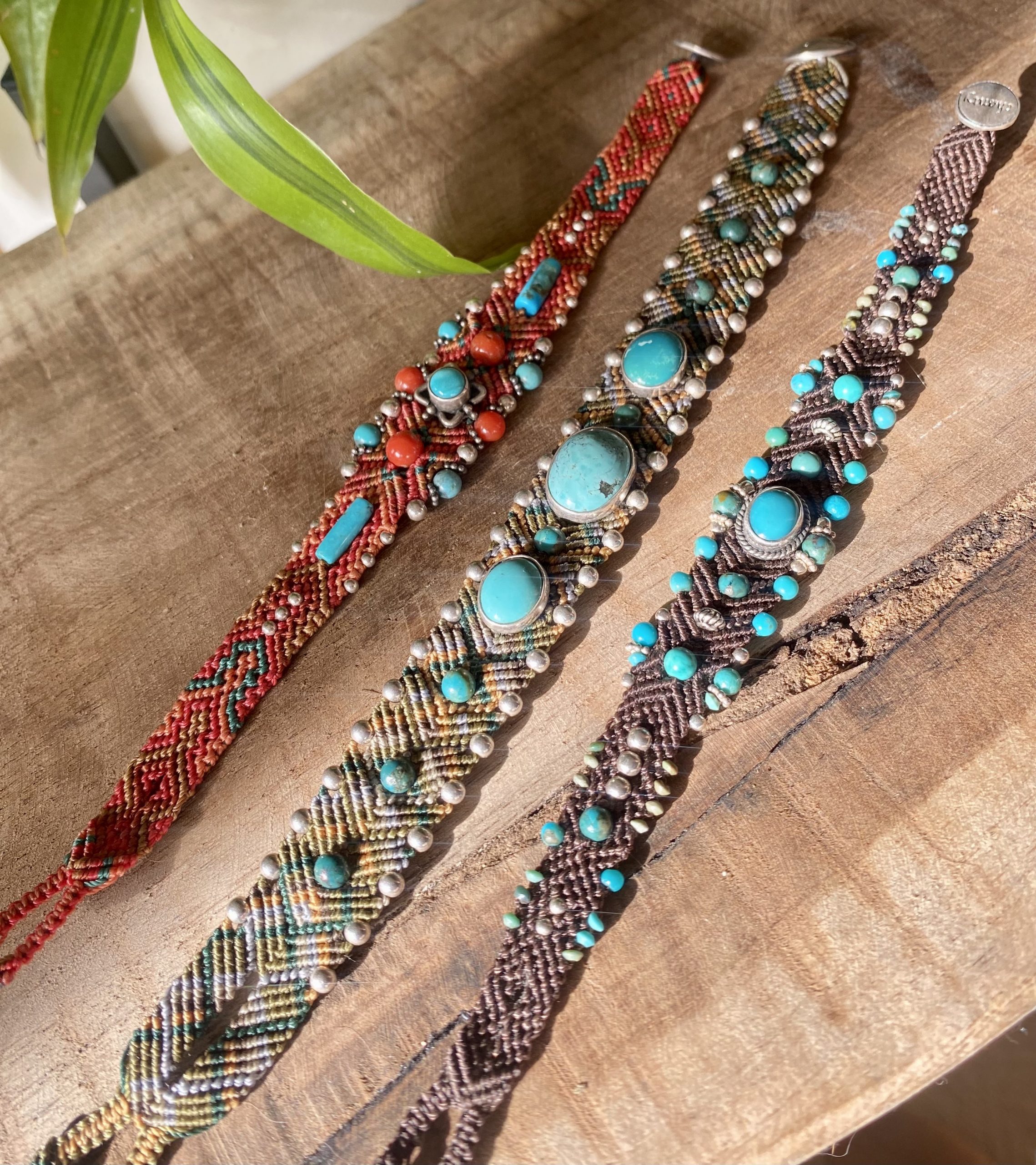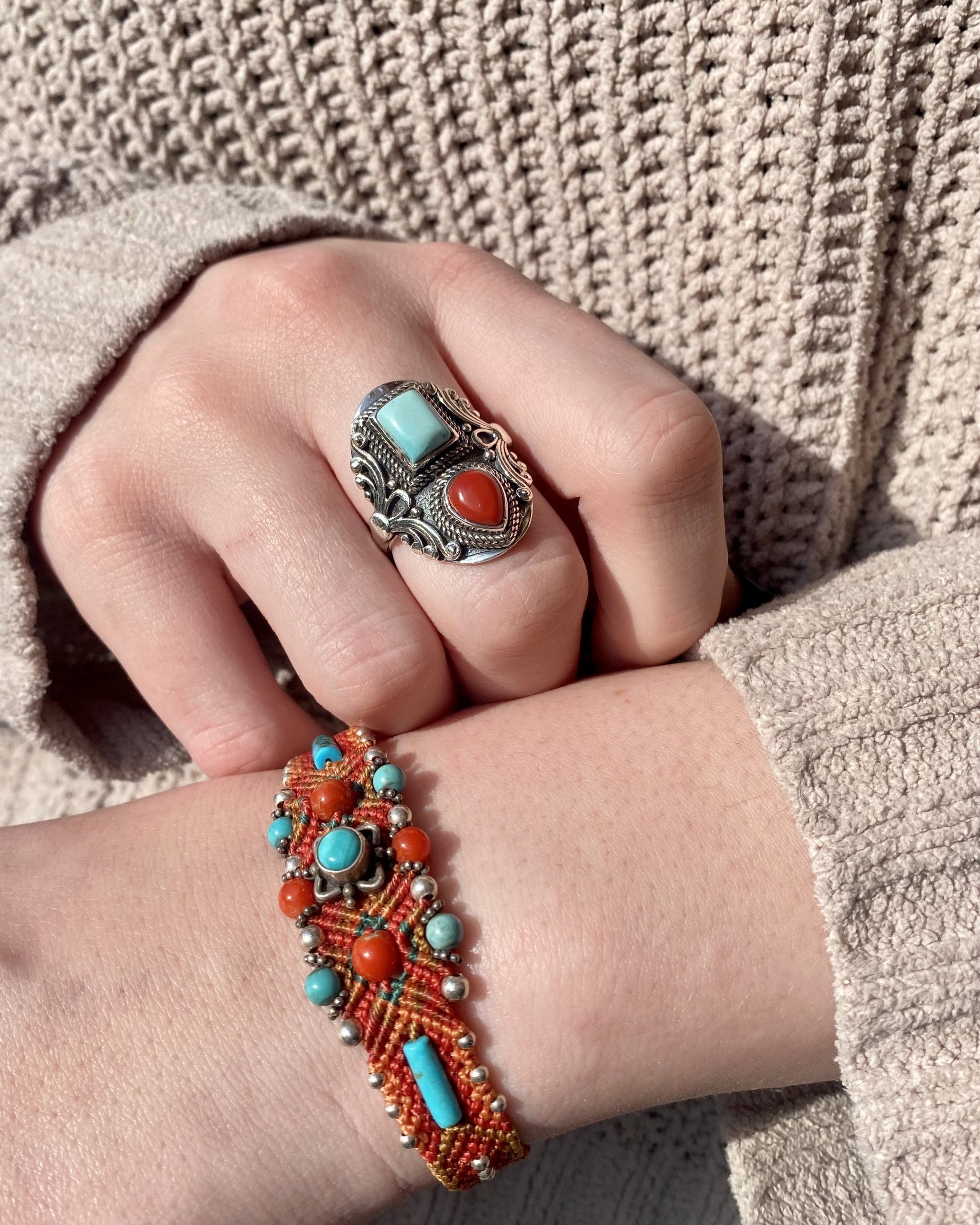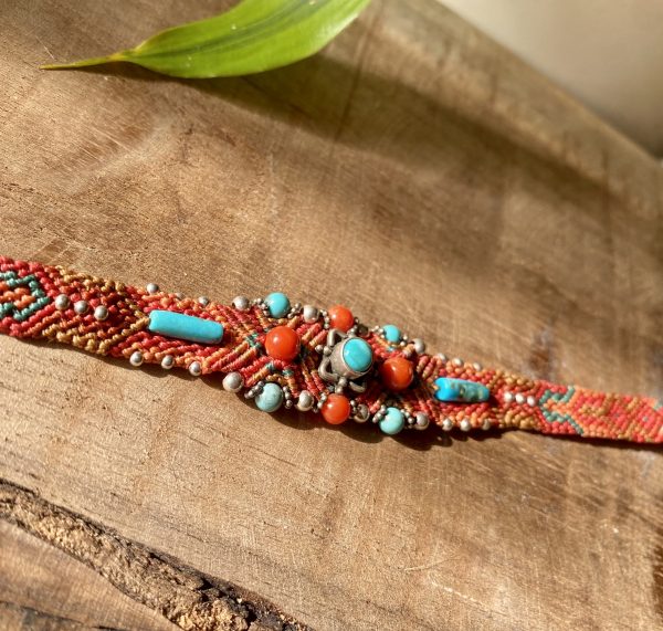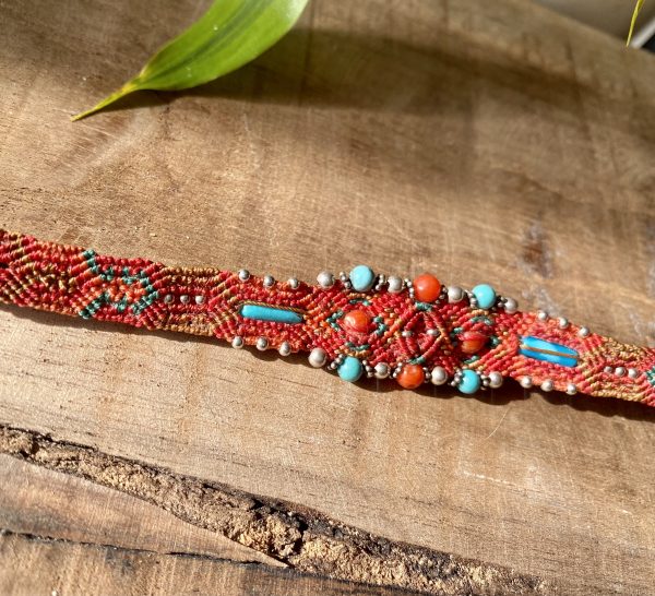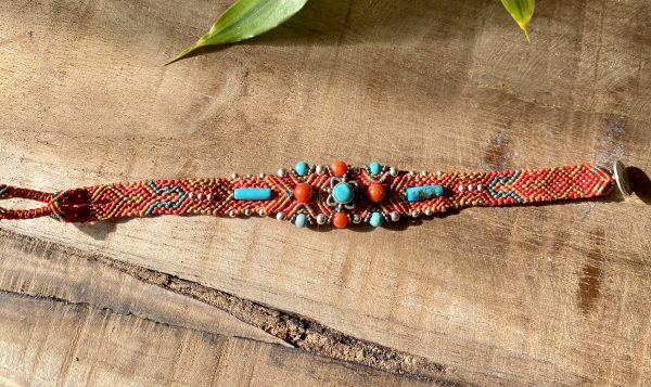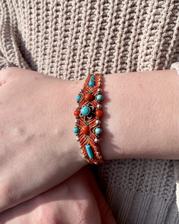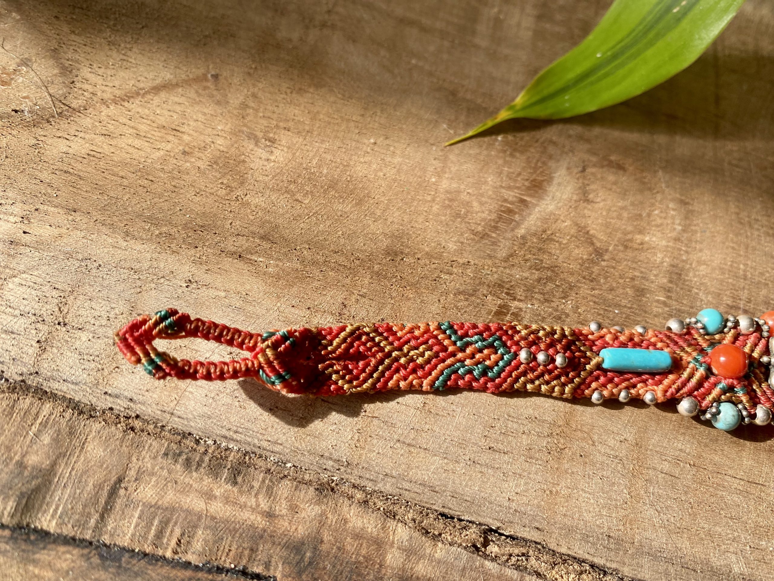 Bracelet Macramé Turquoise et Corail sur Rouge