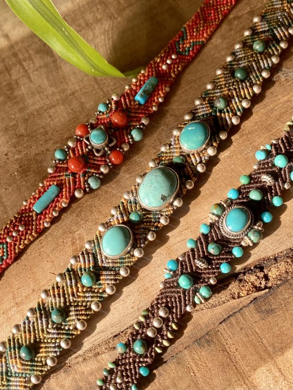 Incorporation des perles en argent 925 , turquoise et corail au fur et a mesure du tissage.
