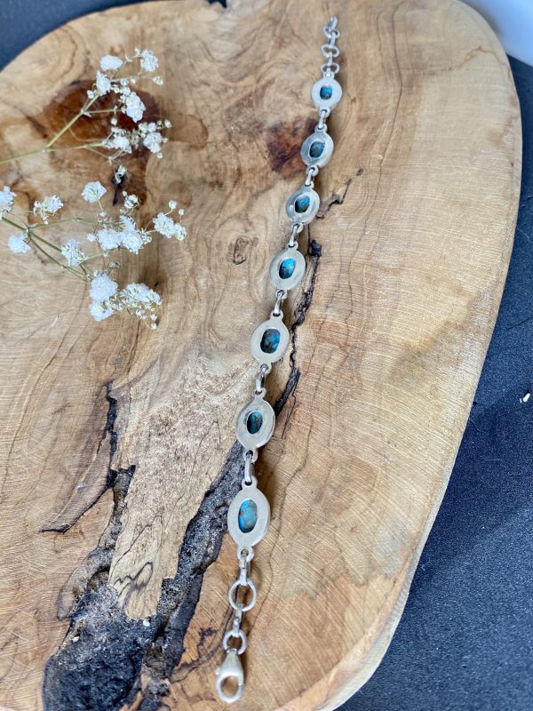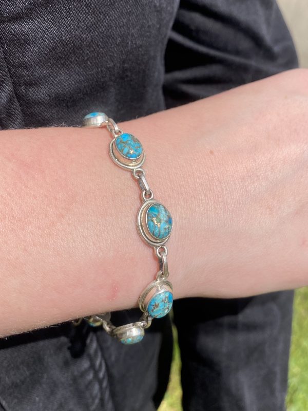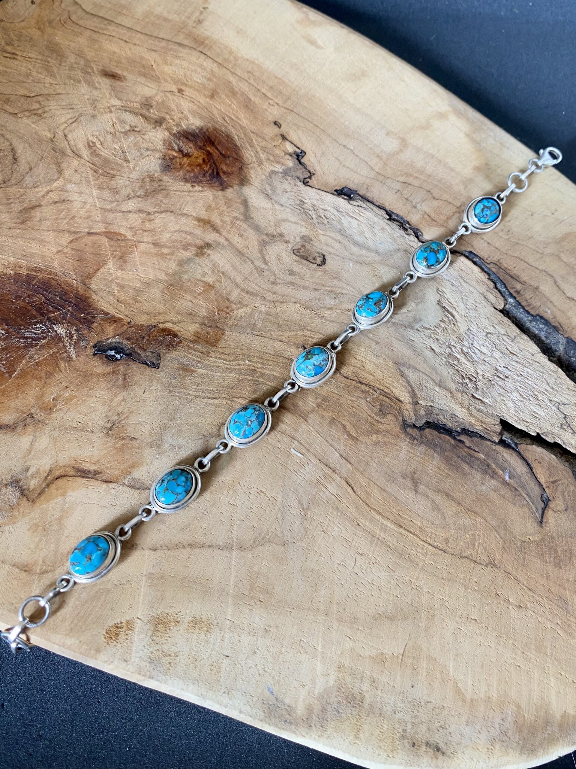Ce magnifique bracelet comporte de très belles pierres de turquoise mohave en sertissage clos.