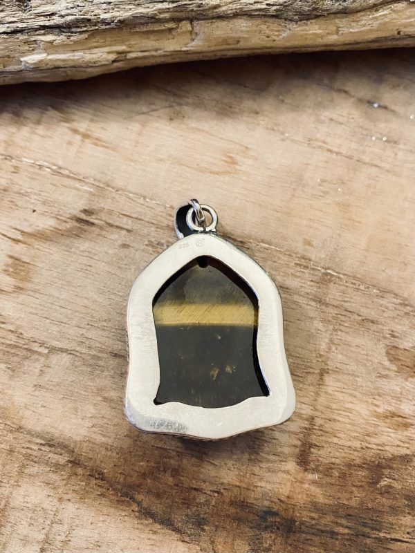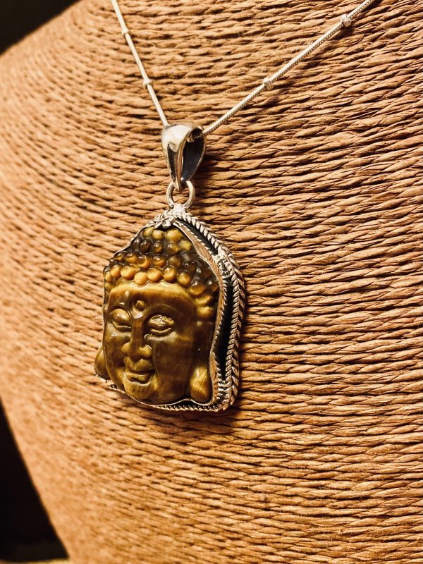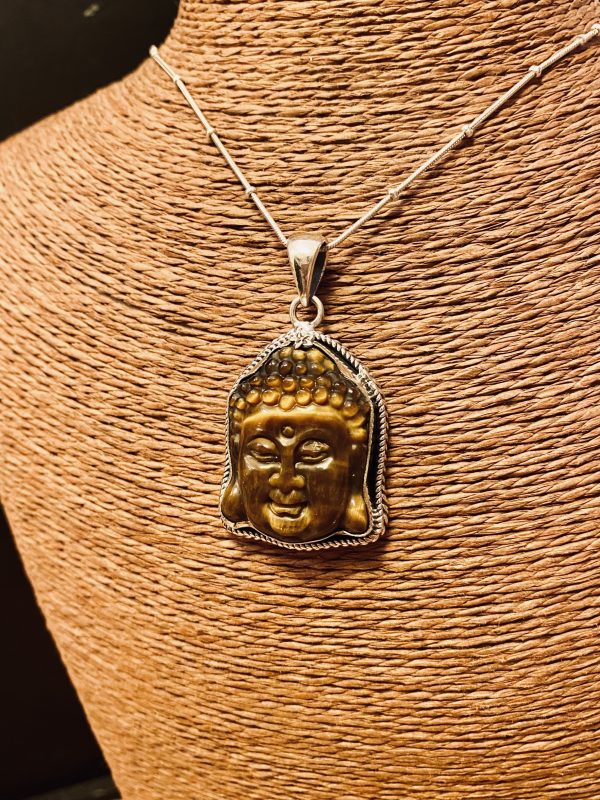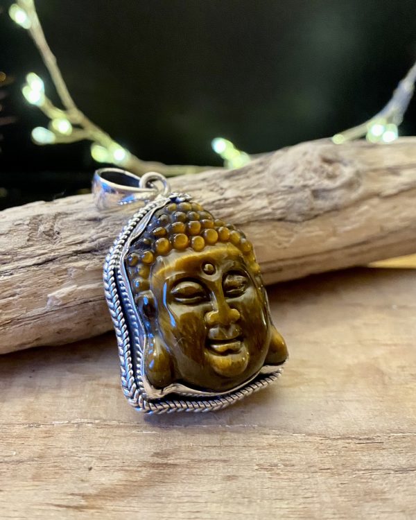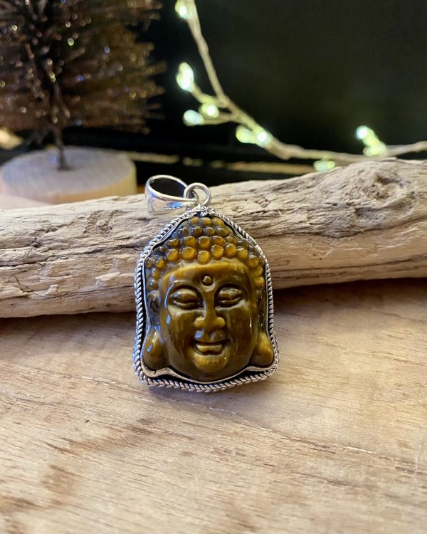 Pendentif en Oeil de Tigre et Argent 925 représentant la tête de bouddha.