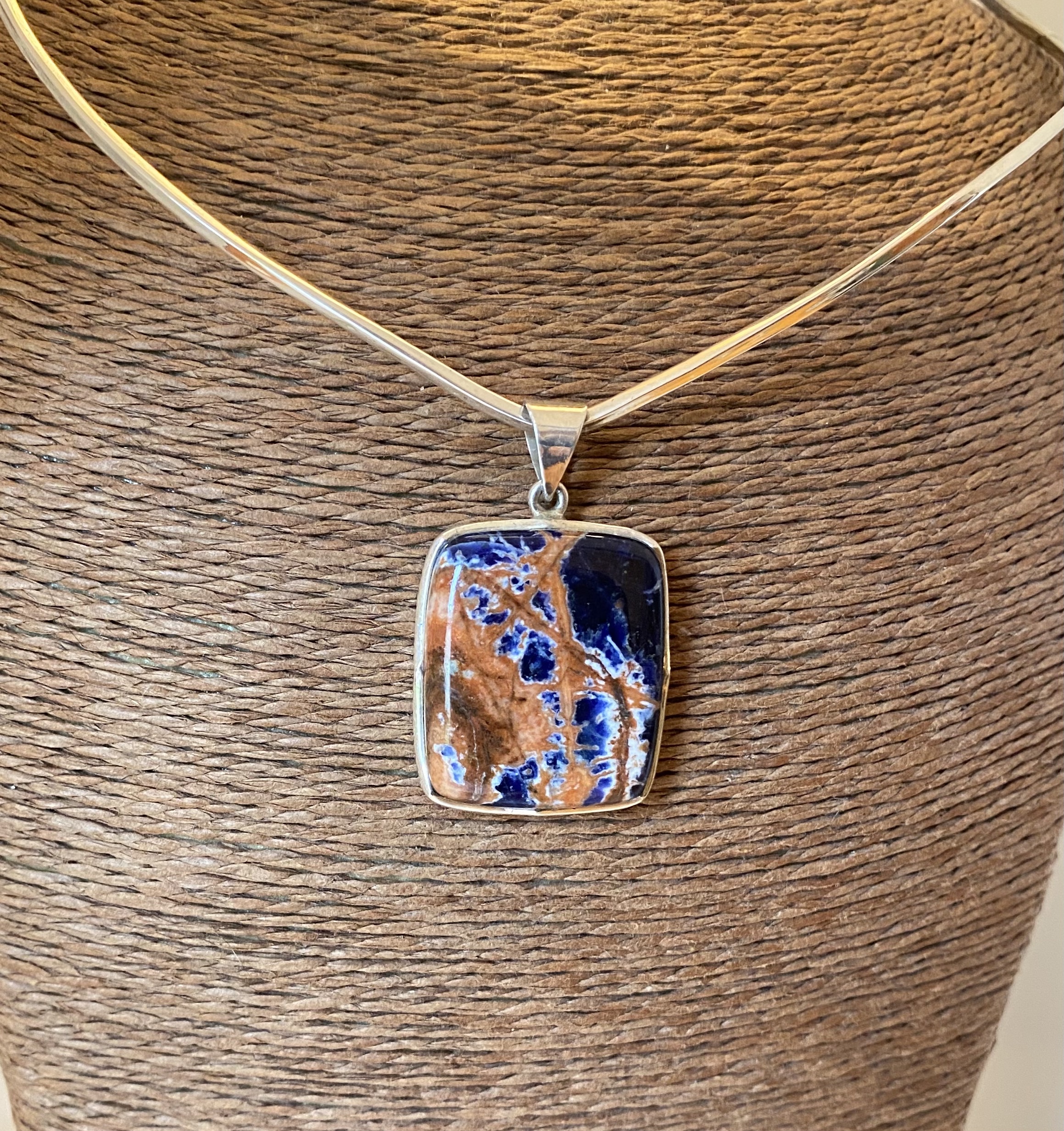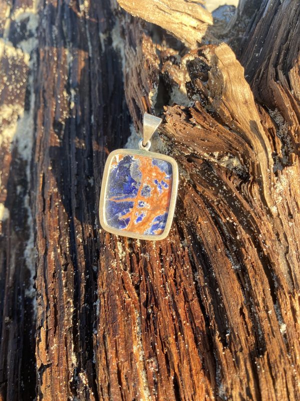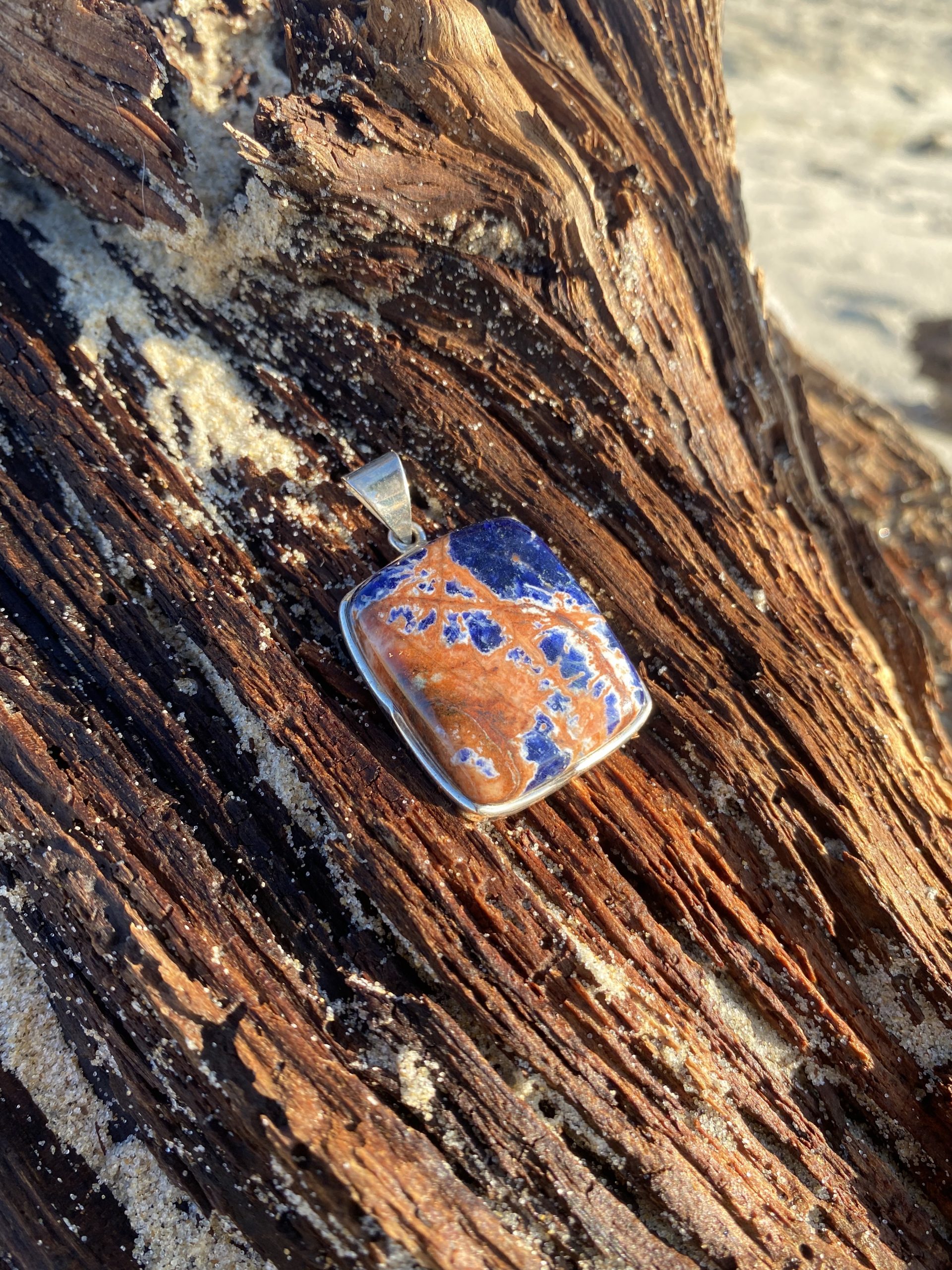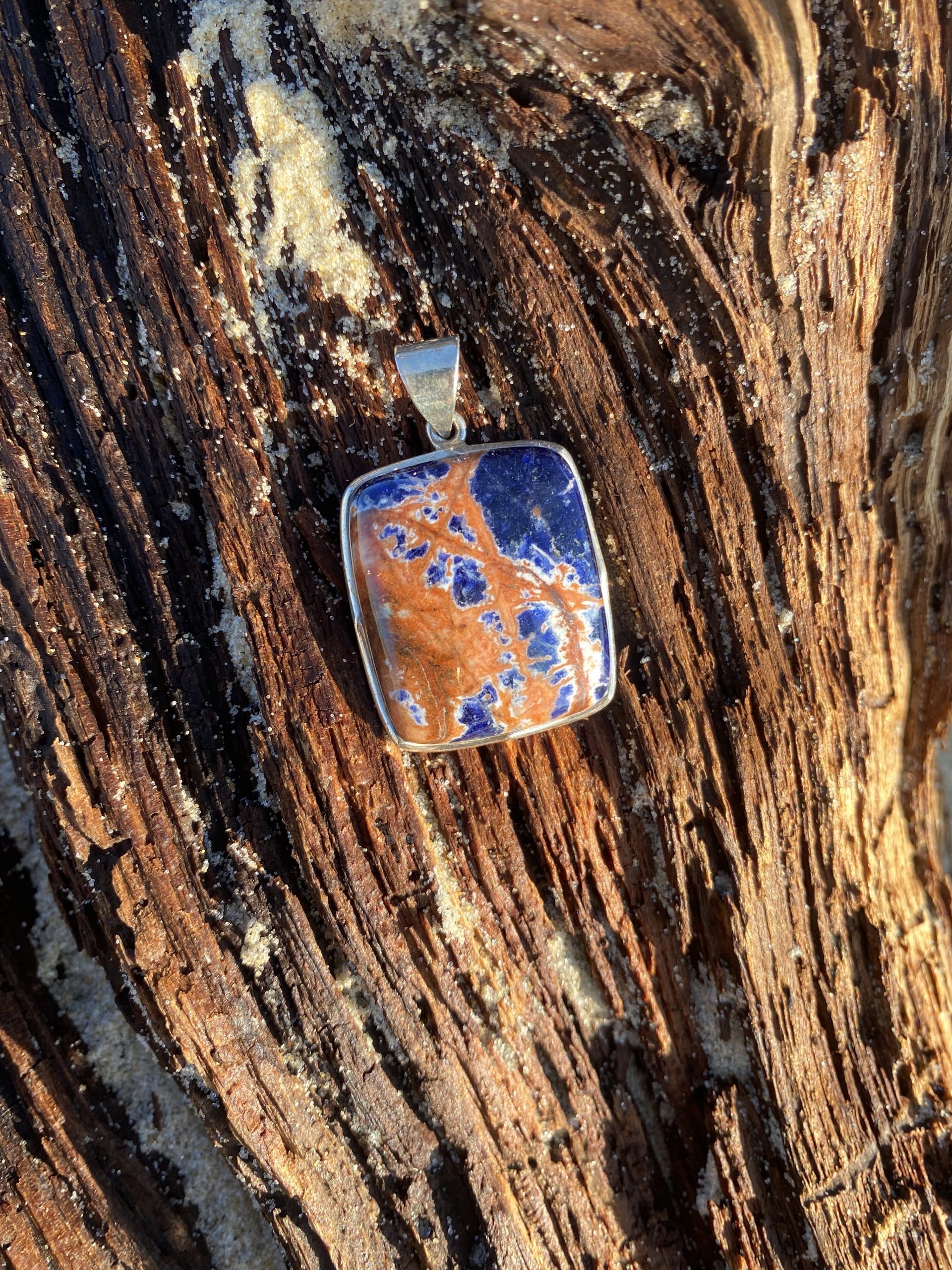 Ce beau pendentif carré présente une sodalite cabochon avec un mélange de bleu, orange et blanc.