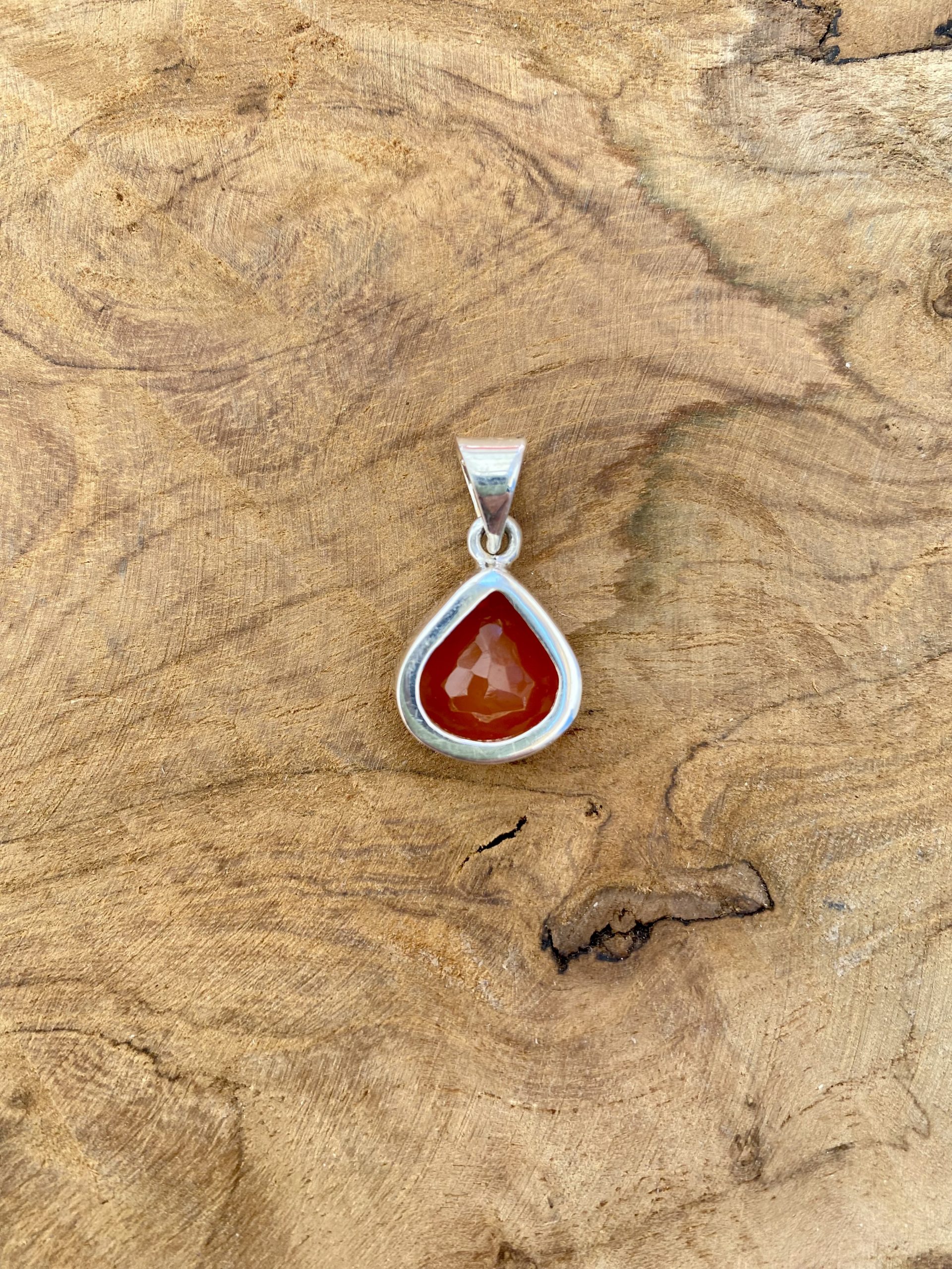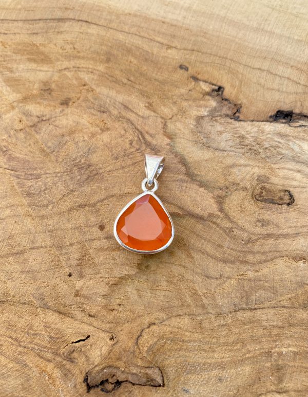 La pierre de ce pendentif a été taillé en forme de poire et travaillé en facette pour laisser découvrir la qualité de cette belle cornaline.