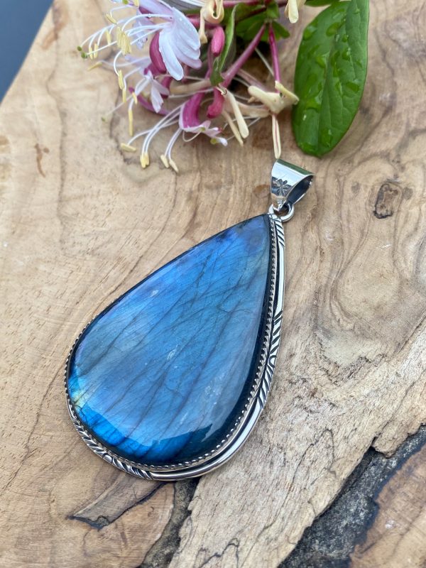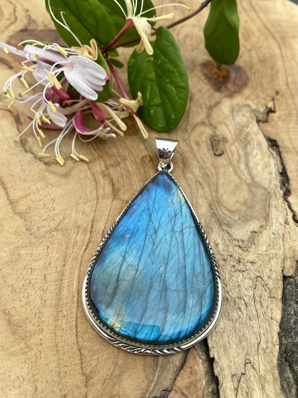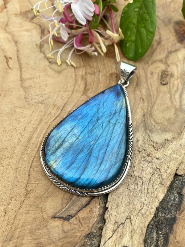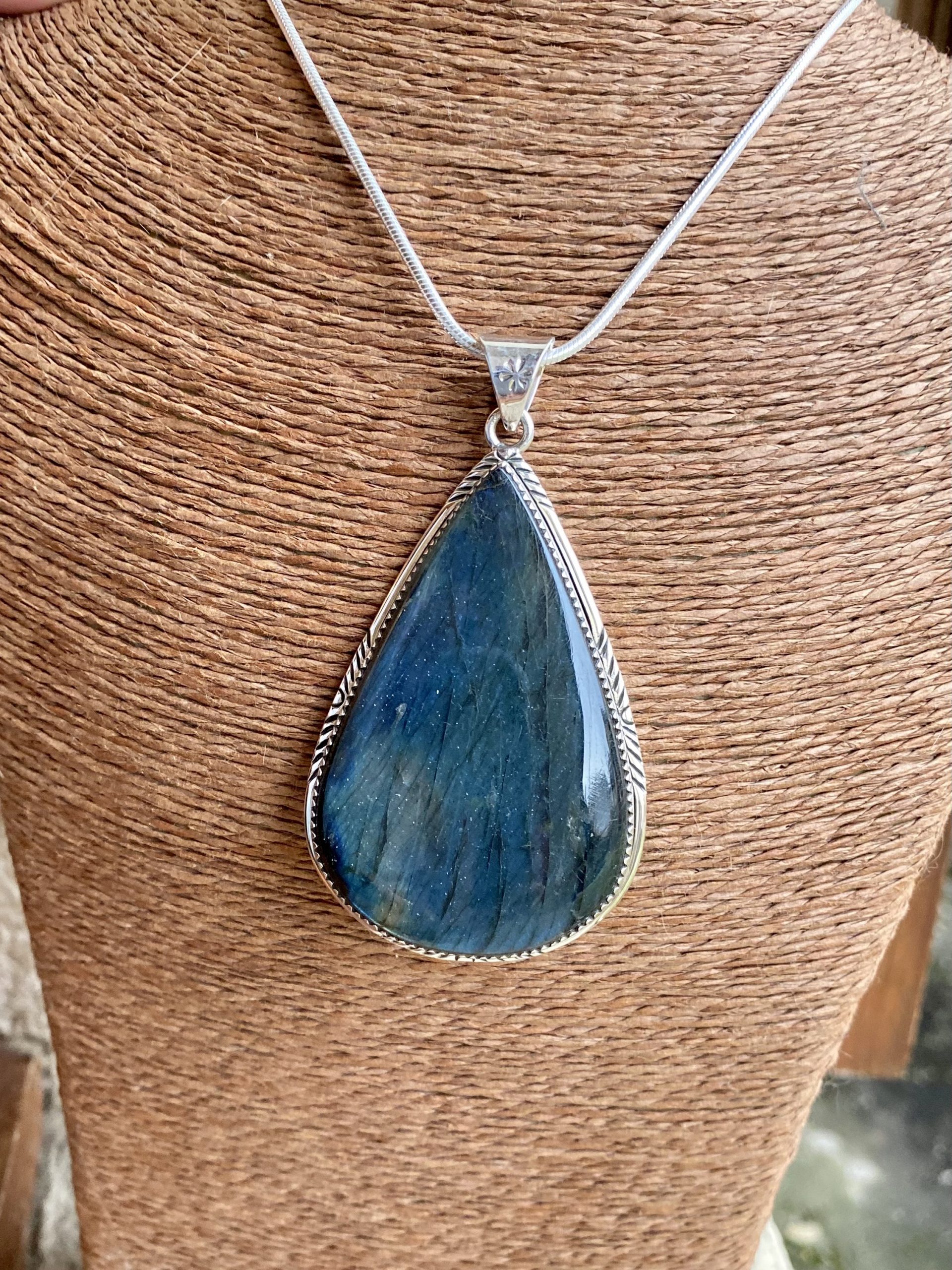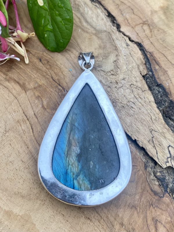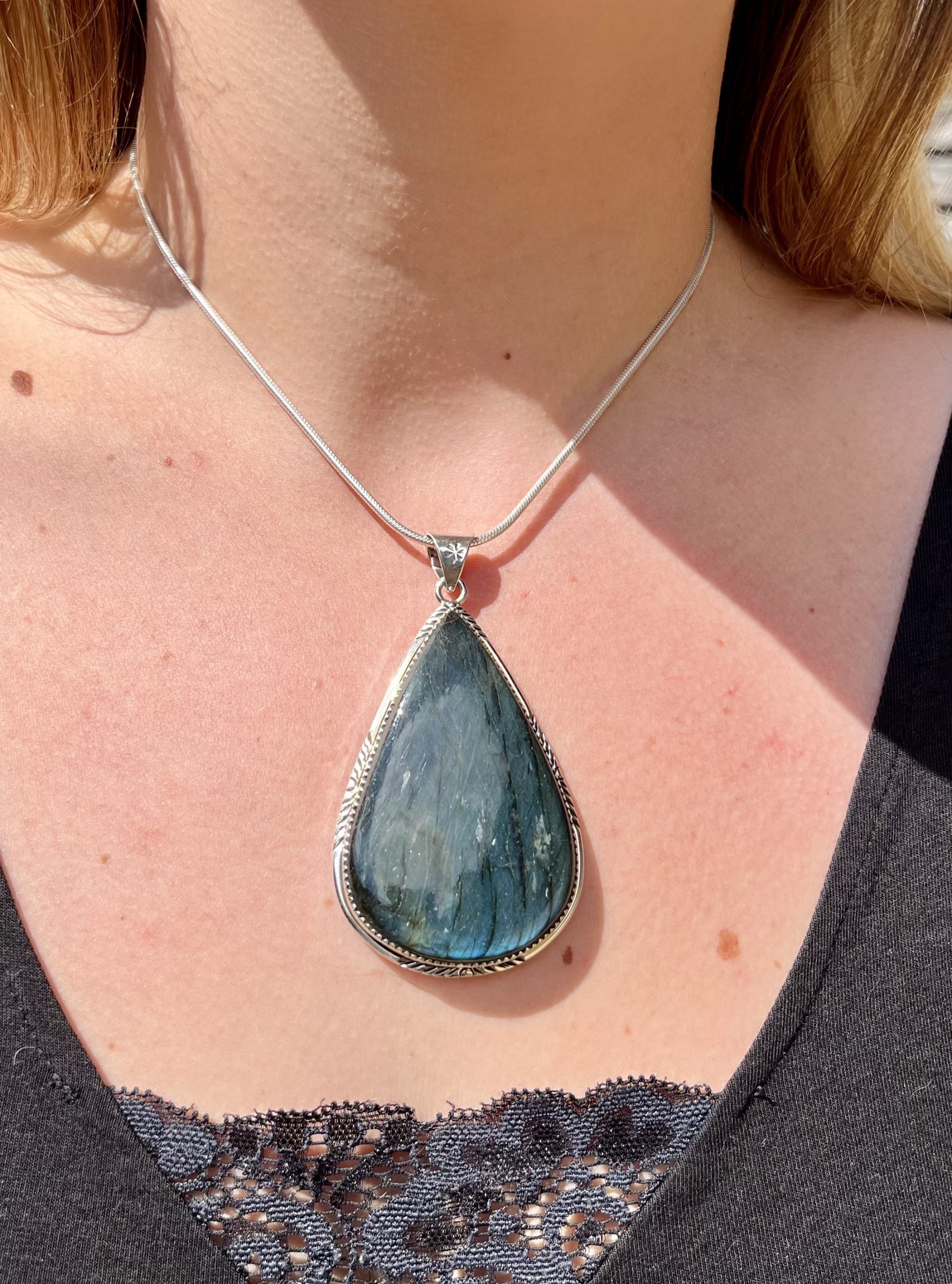 La labradorite de ce pendentif est taillée en cabochon en forme de goutte.