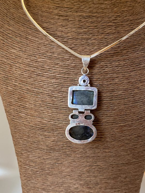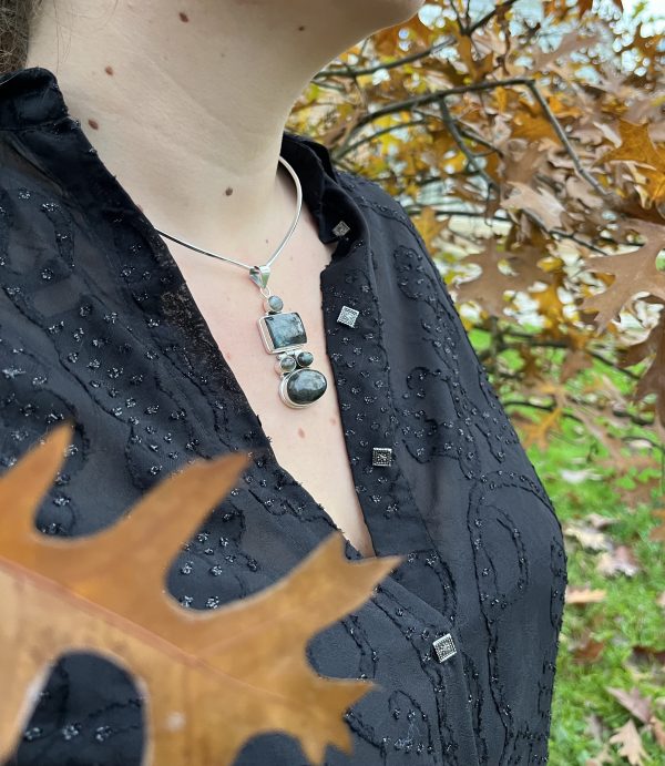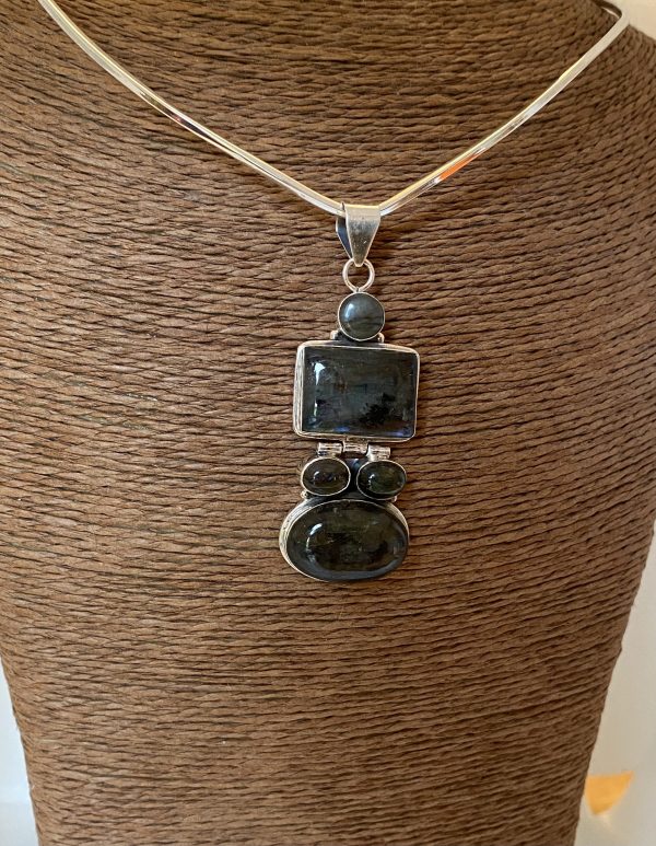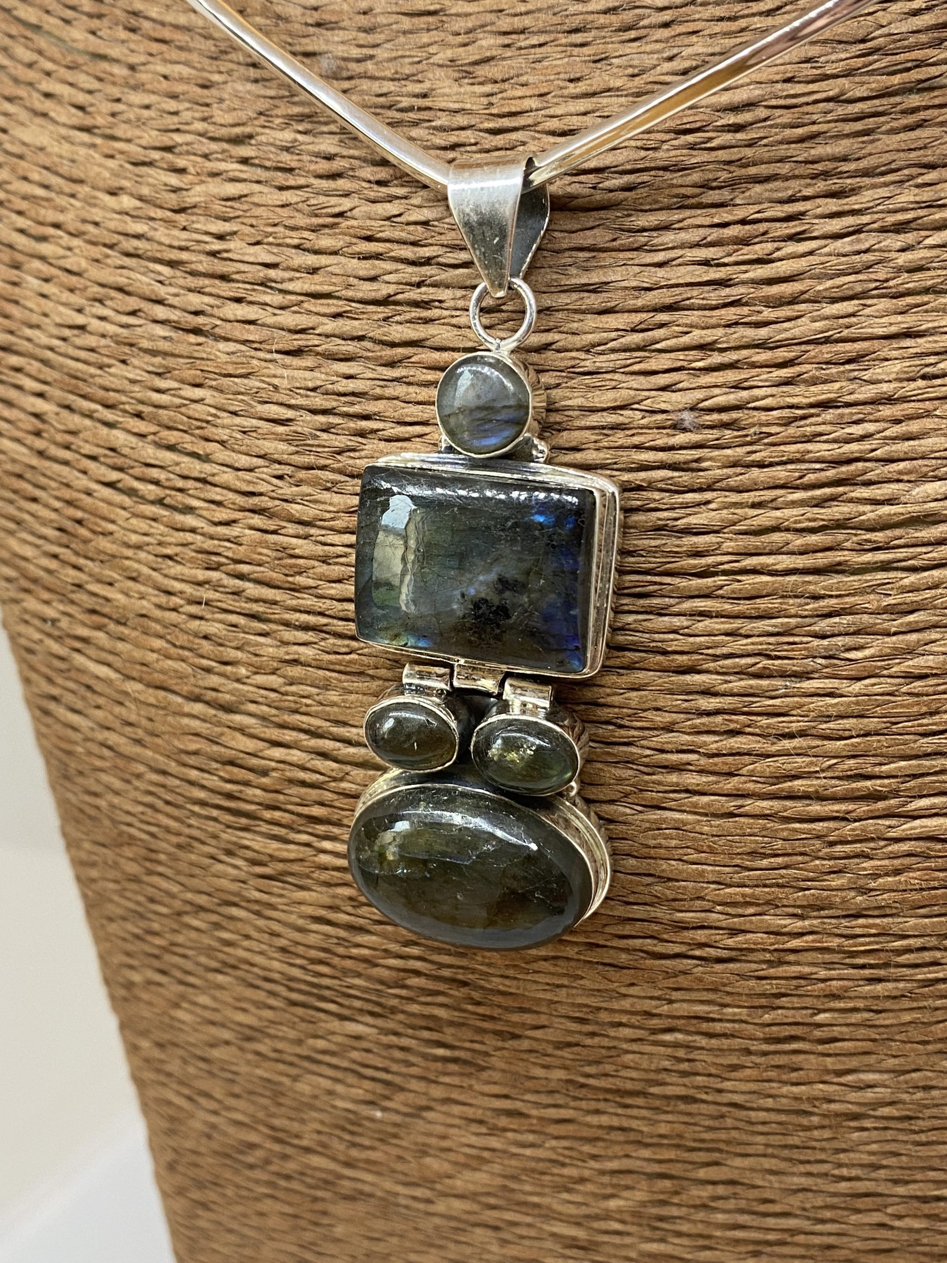 Ce pendentif est composé de 5 pierres de labradorite taillées en cabochon et de différentes formes.